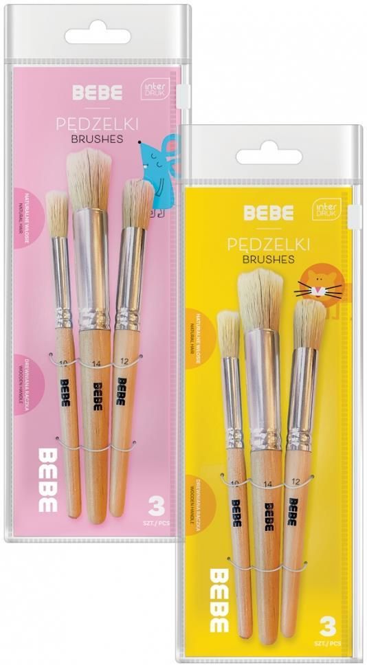 Pędzelki drewniane krótkie grube jumbo 3szt. BBI Kids Pędzelki drewniane Zestaw 3 drewnianych pędzelków o różnych szerokościach i kształtach końcówek. Praktyczne etui z zamknięciem strunowym. Naturalne włosie. Trzonek z naturalnego drewna. 2 wzory opakowania. Pędzelki drewniane z naturalnym włosiem …
