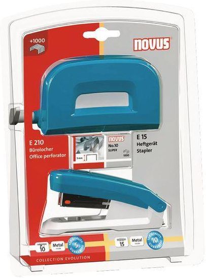 Zestaw archiwizacyjny zszywacz plus dziurkacz Novus E15/E210 plus zszywki TURKUSOWY Elegancki i poręczny zestaw składający się ze zszywacza E15, dziurkacza E210 oraz opakowania zszywek Dziurkacz z ogranicznikiem formatu DIN, dziurkuje do 10 kartek Zszywacz z metalowym rozszywaczem, zszywa do 15 …