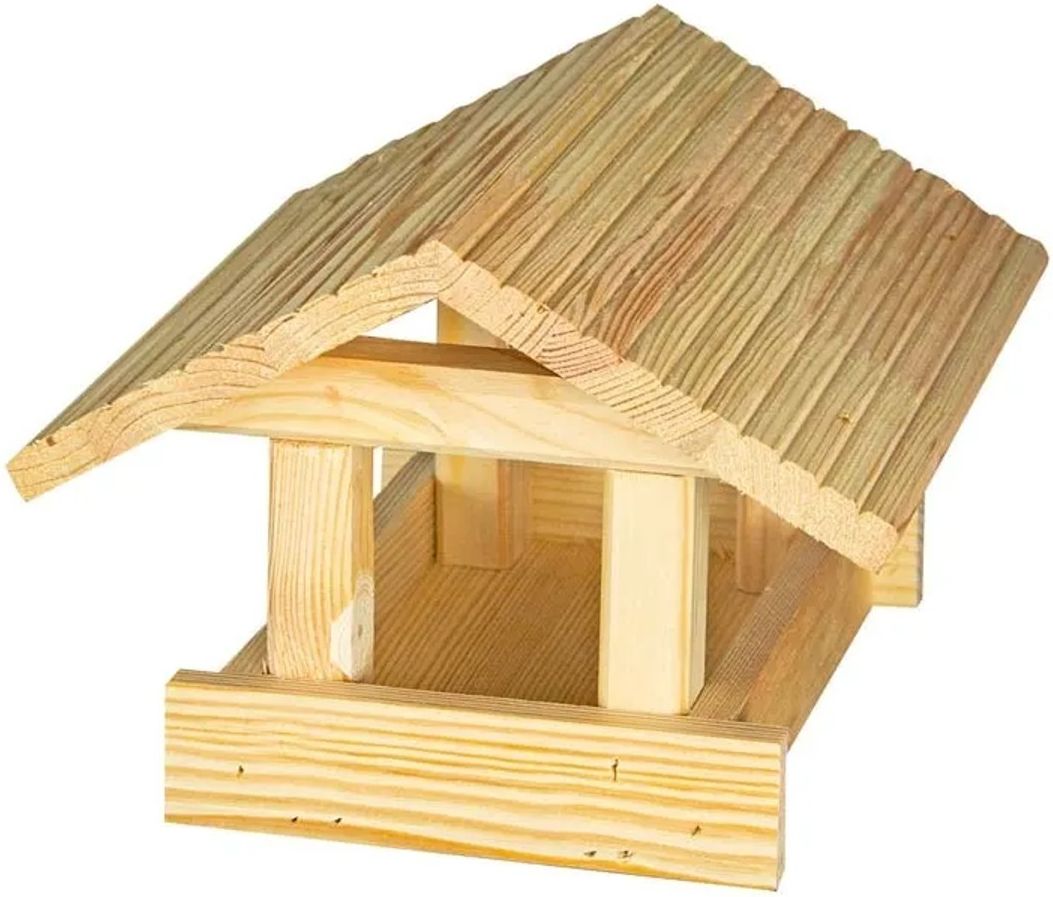 Karmnik dwuspadowy jasny ryflowany Ten duży, solidnie i starannie wykonany, dwuspadowy karmnik z pewnością stanie się ozdobą tarasów, balkonów i ogrodów. Ułatwia dokarmianie ptaków zimujących w kraju. Umożliwia również obserwację z bliskiej odległości m.in. wróbli, gili czy sikorek.