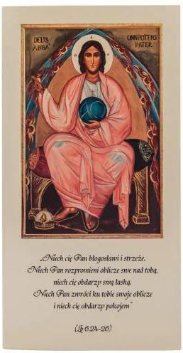 Karnet Z Błogosławieństwem Karnet z Błogosławieństwem w kolorze ecru z perłowym odcieniem to składana kartka w zestawie z kopertą oraz tekstem biblijnym z Księgi Liczb (Lb 6, 24-26): „ Niech cię Pan błogosławi i strzeże. Niech Pan rozpromieni oblicze swe nad tobą, niech cię obdarzy swą łaską. Niech zwróci ku tobie oblicze swoje i niech cię obdarzy pokojem.” Na kartce umieszczona jest kolorowa grafika ikony przedstawiającej Boga Ojca, którego wizerunek jest podobny do Oblicza Chrystusa. Bóg Ojciec błogosławi prawą ręką, a w lewej trzyma kulę ziemską, na której są litery Alfa i Omega czyli początek i koniec. Złoty krzyż, będący zwieńczeniem kuli, przypomina o odkupieńczej ofierze Chrystusa. Bóg Ojciec siedzi na skromnym tronie opromienionym blaskiem Jego światłości, a u stóp ma złożone koronę i berło. Chce przez to pokazać jak bardzo pragnie być blisko człowieka, aby ten bez lęku powierzał Mu swoje radości i troski. Greckie litery imienia, które Bóg objawił Mojżeszowi są wpisane w nimb: „JESTEM, KTÓRY JESTEM” (Wj 3,14). Ikona została podpisana Deus Abba Omnipotens Pater, co oznacza Bóg Ojciec Wszechmogący. Ikona Boga Ojca to nie portret, ale przedstawienie symboliczne. Oryginalna ikona Boga Ojca została wykonana w 1935 roku na podstawie wizji Siostry Eugenii Ravasio. Niestety oryginał zaginął i obecnie rozpowszechniany jest wizerunek wykonany w 1994 roku przez Lię Gladiolo z Padwy, również na podstawie wizji Siostry Eugenii. BŁOGOSŁAWIEŃSTWO to formuła lub gest oznaczające, że komuś dobrze życzysz, aby Bóg udzielił swej łaski. Błogosławieństwa udzielali kiedyś ojcowie rodów swym potomkom, aby byli szczęśliwi, trwali w świętości i byli chronieni przed złem.Ludzie błogosławili też Boga, wielbili Go, wysławiali. W Piśmie Świętym można odnaleźć sceny, w których ktoś ogłasza kogoś błogosławionym np., gdy Elżbieta mówi o Maryi, że jest błogosławiona, bo uwierzyła Bogu. Błogosławieństwo jest udzielane przez kapłana na koniec Mszy św. lub nabożeństw jako znak nieustannej życzliwości Boga wobec ludzi. Błogosławić mogą też rodzice swoje dzieci w dniu I Komunii św., Ślubu albo bez specjalnej okazji. Błogosławieństwo to zasiewanie dobra w świecie i pomnażanie życzliwości wobec innych. Jeśli chcesz złożyć życzenia z okazji Urodzin, Imienin, przyjęcia Sakramentu Bierzmowania, kolejnej rocznicy Ślubu czy Święceń Kapłańskich, to kartka z biblijnym tekstem błogosławieństwa jest świetnym wyborem. Zadbaj, aby Twoje życzenia były napisane własnoręcznie, a nie SMSem. Podtrzymaj tradycyjny sposób składania życzeń Twoim bliskim, weź do ręki długopis i zastąp klawiaturę. Rozmiar kartki: 19,5 cm x 10,5 cm
