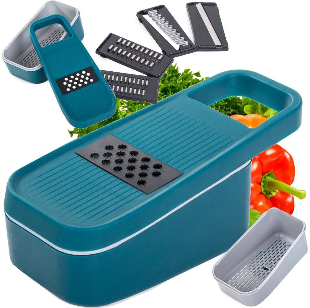 WIELOFUNKCYJNA TARKA DO WARZYW I OWOCÓW SZATKOWNICA KRAJALNICA OCIEKACZ Krajalnica to wielofunkcyjne urządzenie do warzyw i owoców zapewniająca same korzyści ułatwiając pracę w kuchni. Perfekcyjne pokroi w kostkę, plasterki, paski wszystkie owoce, warzywa, ugotowane jajka czy żółty ser oraz poszatkuje kapustę na sałatę. Dzięki tarce, bez problemu, zetrzesz ser bezpośrednio do pojemnika. Do zestawu dołączonych jest pięć wymiennych ostrzy. Wszystkie ostrza krajalnicy są zrobione ze stali i są bardzo ostre. Zestaw zawiera koszyczek do odsączania warzyw i owoców. Bardzo przydatny gdy chcemy pozbyć się nadmiaru wody. TARKA WYPOSAŻONA JEST W PIĘĆ RÓŻNYCH OSTRZY: ✅ Ostrze cienkie paski ✅ Ostrze grubsze paski ✅ Ostrze do ucierania ✅ Ostrze do robienia fali ✅ Ostrze do plastrów SPECYFIKACJA TECHNICZNA: ✅ Kod produktu: 24213 ✅ Materiał wykonania: tworzywo sztuczne, stal ✅ Pięć różnych ostrzy ✅ Plastikowy pojemnik ✅ Koszyczek/ ociekacz ✅ Wygodny uchwyt ✅ Łatwa w czyszczeniu ✅ Solidna konstrukcja ✅ Kolor: niebieski WYMIARY: ✅Długość pojemnika: 21cm ✅Szeroość pojemnika: 11,5cm ✅ Maksymalna wysokość tarki: 12,5cm ✅ Maksymalna długość tarki: 27,5cm ZESTAW ZAWIERA: ☑️ Fabrycznie nową tarkę do warzyw i owoców ☑️ Pojemnik ☑️ Koszyczek/ ociekacz ☑️ Pięć wymiennych ostrzy ☑️ Oryginalne opakowanie