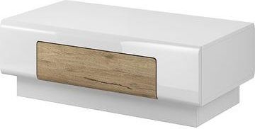 Stolik kawowy z szufladą TYP99 TOLEDO HELVETIA Stolik kawowy z szufladą z kolekcji TOLEDO idealnie uzupełni aranżację wnętrza w nowoczesnym stylu. Został wykonany z wysokiej jakości płyty pokrytej folią membranową w wysokim połysku, dzięki czemu jest odporny na zarysowania oraz promienie słoneczne. Stolik został wyposażony w praktyczną szufladę, która pozwoli utrzymać porządek na stoliku i zapewni miejsce do przechowywania podręcznych przedmiotów. Stolik dostępny jest także w kolorze antracytowym. Kolor: biały połysk + dąb san remo Wymiary: Szerokość - 60 cm Długość - 110 cm Wysokość - 39 cm Mebel wysyłany jest w paczkach do samodzielnego montażu. Efektownie połączone kolory, przykuwające uwagę uchwyty zamontowane w witrynach i szafie oraz delikatne poziome frezowania sprawią, że kolekcja Toledo stanie się ozdobą każdego salonu. Fronty wykonane zostały z płyty MDF pokrytej folią membranową zapewniającą trwałość na lata. Szuflady posiadają funkcje pełnego wysuwu, a hartowane szkło w komodach i witrynach zapewnia bezpieczeństwo. To idealny zestaw mebli do nowoczesnego salonu i pokoju dziennego.