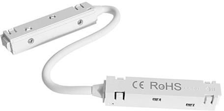 Łącznik zasilający kątowy dwustronny z przewodem do szyn oświetleniowych magnetycznych białych na napięcie 48V. Łącznik zasilający dwustronny kątowy, pozwala przenieść napięcie między szynami oświetleniowymi magnetycznymi połączonymi ze sobą przez łącznik metalowy kątowy L (szynę kątową). Łącznik kątowy, "wklikuje" się w dwie szyny połączone ze sobą, i napięcie między jedną szyną a drugą szyną oświetleniową jest połączone. Zastosowanie: białe szyny magnetyczne natynkowe DML-B, białe szyny magnetyczne podtynkowe DML-A, białe szyny magnetyczne podtynkowe DML-C.
