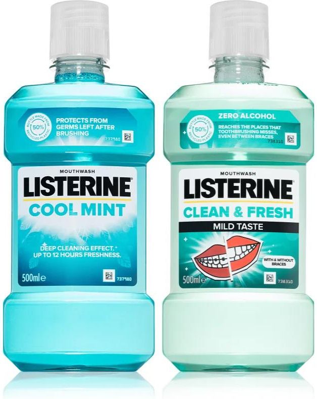 Listerine Duopack, , Płyny i spraye do higieny jamy ustnej dla kobiet, Płyn do płukania jamy ustnej Listerine Duopack nie tylko odświeża oddech, ale jednocześnie walczy z osadem nazębnym i pomaga zachować zdrowe dziąsła i zęby. Zawartość zestawu: Cool Mint płyn do płukania ust 500 ml Clean Fresh płyn do płukania ust 500 ml Właściwości: odświeża oddech zapobiega rozwojowi próchnicy zębów niszczy bakterie chroni dziąsła Sposób użycia: Po wyczyszczeniu zębów przepłucz usta płynem do płukania jamy ustnej przez tyle czasu, ile podano na opakowaniu, a potem wypluj.