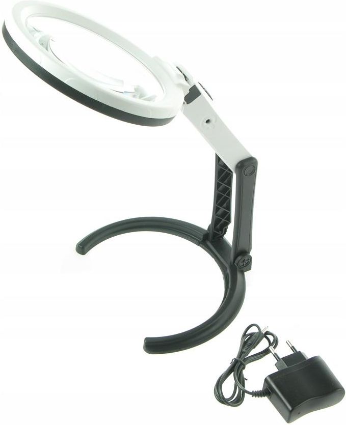 Przedmiotem aukcji jest rozkładana lupa ręczna z podświetleniem LED Niezwykle przydatne urządzenie zwłaszcza modelarzy, numizmatyków, elektroników, ale również do celów kosmetycznych Cechy produktu: Lupa wykonana z tworzywa Duża podstawka zapewnia stabilność podczas użytkowania Dwuogniskowa soczewka Regulacja wysokości oraz kąta nachylenia lupy Możliwość przekształcenia na lupę ręczną Wbudowany przycisk włączający diody LED W zestawie zasilacz Lupa wyposażona w 10 diod LED Zasilana na 2 baterie typu AA (R6) Wymiary: Długość złożonej lupy (lupa ręczna): 28 cm Szerokość podstawy: 17 cm Maksymalna wysokość: 24 cm Soczewka: Główka: przybliżenie x2, średnica 120 mm Precyzyjna: przybliżenie x5, średnica 28 mm