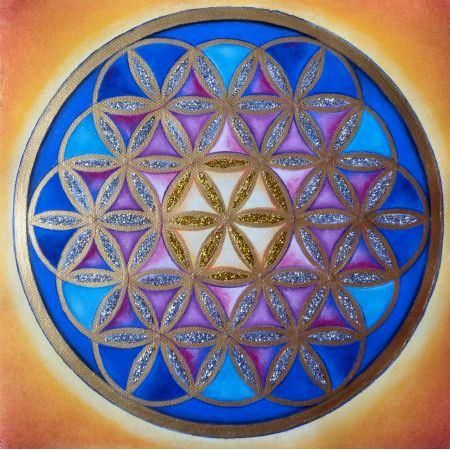 Nazwa tego pięknego symbolu jest reprezentacją cyklu wegetacji drzewa rodzącego owoce. To symboliczny zapis budowy naszego Wszechświata, są tu wszystkie atomy, poziomy, wymiary dosłownie wszystko co istnieje w naszym Wszechświecie w formie fal, jak również pierwowzór (matrycy) naszego Istnienia. Za pomocą Kwiatu Życia i Świętej Geometrii możemy opowiedzieć historię jak powstawał nasz świat. Jak widać, Kwiat Życia to nieskończony przepływ informacji. Kwiat życia promieniuje wysokimi wibracjami. Harmonizuje przestrzeń, transformuje szkodliwą energię, jest to jeden z najsilniejszych pozytywnych symboli Świętej Geometrii. Wszystko we Wszechświecie posiada swoje przeciwieństwa, które jak dwie połowy uzupełniają się i tworzą całość. Każda połowa posiada potencjał drugiej. Podobnie jest z barwami. Każda barwa ma swoje przeciwieństwo tzw. dopełnienie. Połączenie w Mandali barwy podstawowej wraz z jej przeciwieństwem tworzy najsilniejszy z możliwych kontrast, na który reaguje w sposób spontaniczny i bardzo pozytywny nasz mózg. Oryginalna barwa oraz jej dopełnienie łączą się na poziomie energetycznym wytwarzając wokół siebie pozytywne wibracje, wspierające osobę, która jest w pobliżu. Zrównoważenie barw to dobre zdrowie, samopoczucie i wewnętrzne szczęście. Mandala swoją obecnością wprowadza do pomieszczenia i życia odprężenie i spokój, radość i przyjemność. Ułatwia naukę, być bardziej twórczym, ekspresyjnym oraz w wypowiadaniu myśli. Barwa niebieska pomaga się rozluźnić i cieszyć się własnymi emocjami. Kolor pomarańczowy zachęca do radości, lekkości, przyjemności nawet wyzwolenia. Kolory mało tego, że wypełniają nasz świat zewnętrzny to przenikają głęboko do naszych ciał. Technika wykonania: Obraz ma wymiar 30 x 30 cm. Malowany jest farbą akrylową i suchą pastelą. Jest możliwość zamówienia mandali w innych barwach i w innym formacie. Istnieje możliwość namalowania obrazu w dowolnych kolorach. Obraz jest oprawiony w antyramę plexi.