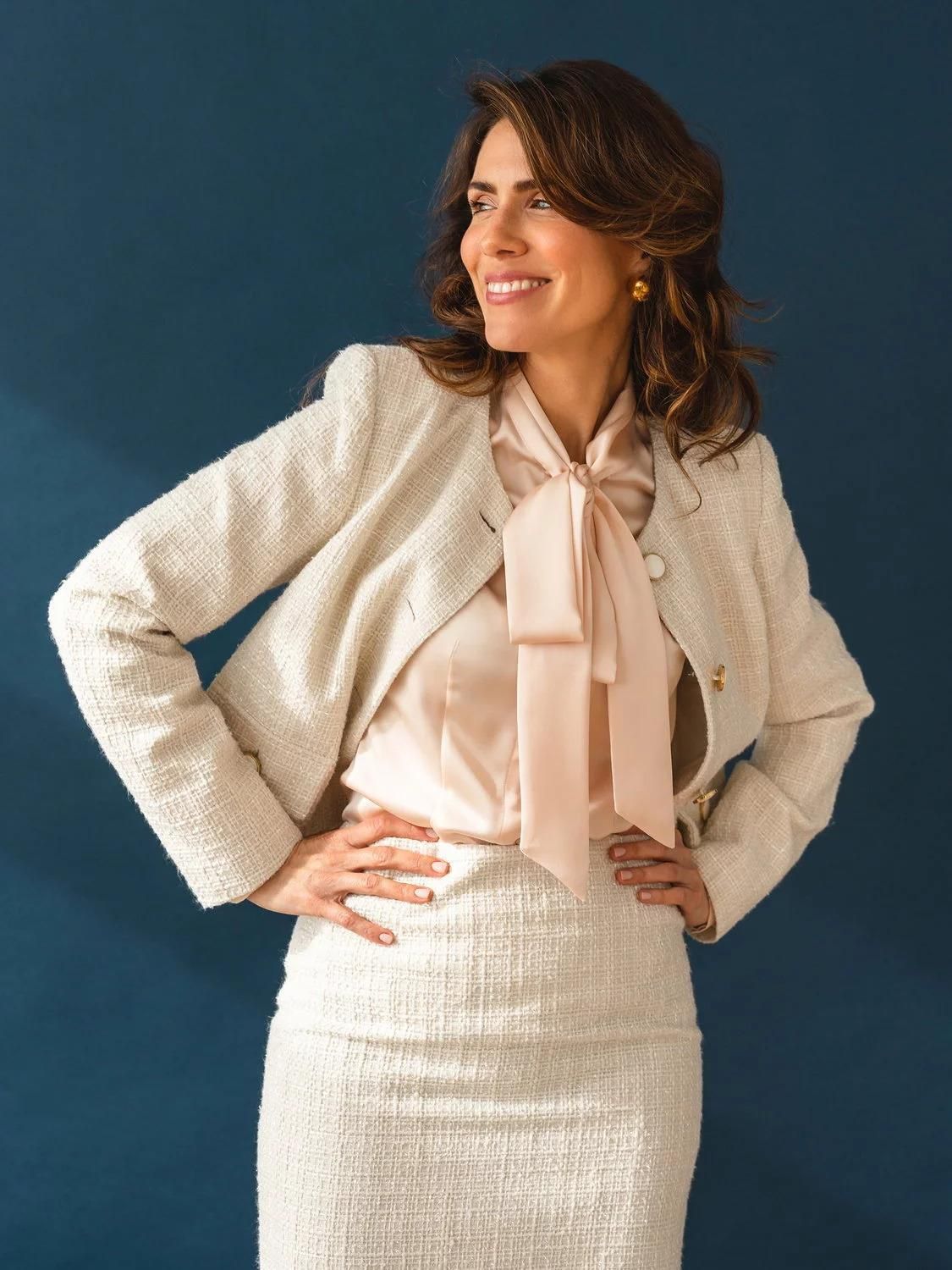Marynarka z tkaniny boucle Podkreśl swój profesjonalizm i wyrafinowany styl dzięki naszej eleganckiej marynarce z tkaniny typu boucle w subtelnym odcieniu śmietankowej bieli. Ten starannie skrojony model charakteryzuje się dopasowanym, lecz nie krępującym ruchów fasonem z elementami pudełkowego kroju. Krótka długość subtelnie akcentuje talię, a lekko zaznaczone ramiona nadają sylwetce struktury i elegancji. Okrągły dekolt dodaje marynarce subtelnej kobiecości, a ozdobne guziki w dopasowanym odcieniu stanowią wyrafinowany detal. Ten stylowy żakiet idealnie dopełni zarówno formalne, jak i bardziej eleganckie, codzienne stylizacje. Tkanina: 100% poliester Skład podszewki: 94% poliester, 6% elastan Rodzaj marynarki: krótka, jednorzędowa zapinana na duże, ozdobne guziki Kolor główny: jasnobeżowa Producent: Willsoor Gwarancja: 24 m-ce Uszyta w Polsce