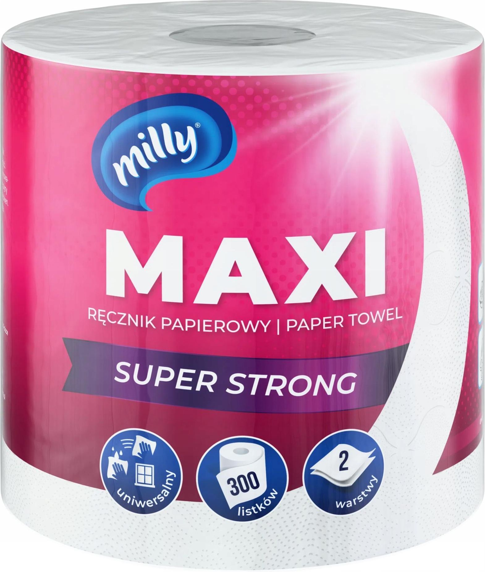 Milly Super Strong ręcznik papierowy 2 warstwyDwuwarstwowy ręcznik o doskonałej chłonności i wytrzymałości. Dzięki specjalnej mieszance włókien i innowacyjnej technologii tłoczenia, absorbuje płyny efektywnie i nie pozostawia smug ani włókien. Idealny do skutecznego czyszczenia.