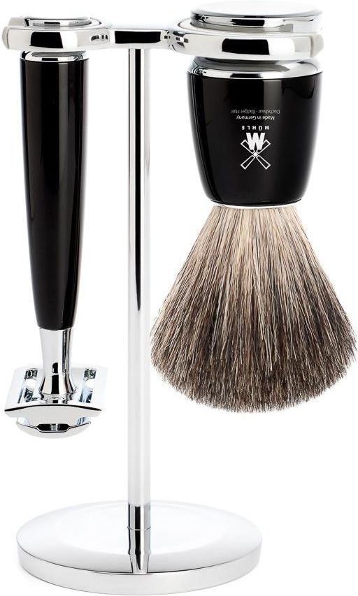 Muhle RYTMO zestaw z maszynką i pędzlem do golenia S81M226SR model: S81M226SRMarka Manduuml;hle to producent eksluzywnych akcesorii do golenia takich jak tradycyjne maszynki na żyletki lub wkłady Gillette, pędzle do golenia oraz kosmetyki, których jakość firma dopracował do perfekcji kojarzonej z hasłem Made in Germany.Idealnie skomponowany zestaw do tradycyjnego golenia na mokro Muhle Rytmo model S81M226SR składający się z wzajemnie pasujących do siebie elemtów, czili ze stojaka, pędzla do golenia i maszynki na żyletki. Zawarty w zestawie pędzel wykonany jest ze starannie selekcjonowanego naturalnego włosia borsuka (klasa pure) poddanego specjalnemu procesowi obróbki, dzięki któremu włosy są proste, zmiękczone i miłe dla skóry. Rączka pędzla, nadająca mu znamiona produktu luksusowego, to połączenie elementów wykonanych z wysokiej jakości życicy syntetycznej w kolorze czarnym z metalową podstawą pokrytą wysokopółyskującym chromem. Na rączce zostało również umnieszczone logo producenta Muhle.3-częściowa maszynka do golenia, do której pasują wszystkie standardowe żyletki różnych firm, znakomicie nadaje się do codziennego golenia. Rękojeść odlana jest z wysokogatunkowej połyskującej żywicy syntetycznej w kolorze czarnym. Rączka posiada dodatkowo chromowane elementy i zostało na niej umieszczone logo producenta Muhle.Świetnie zbalansowana maszynka zapewnia precyzyjne golenie i jest doskonałą, znacznie tańszą w utrzymaniu alternatywą dla maszynek systemowych. Solidny i trwały produkt, który posłuży na lata. Przybliżone wymiary pędzla:Wysokość całkowita - 10,5 cmWysokość rączki - 5 cmDługość włosia - 5,5 cmSzerokość knota u podstawy - 2,1 cmWaga - 105 g Przybliżone wymiary i waga maszynki:Długość całkowita - 10,5 cmDługość rączki - 9,9 cmWaga - 67 g Cały zestaw zapakowany jest w firmowe pudełko Muhle - jest to znakomity pomysł na prezent dla pana na różne okazje jak: dzień dziadka, dzień ojca, imieniny męża lub po prostu dla chłopaka np. jako prezent pod choinkę. Produkcja: Niemcy