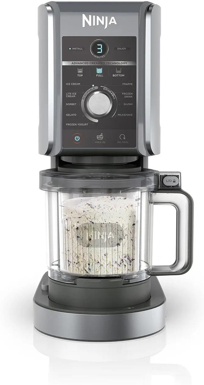 Ninja NC502EU Creami Deluxe 10-in-1 NC502EU Dzięki wielofunkcyjnej maszynce do lodów Ninja CREAMI Deluxe możesz zamienić niemal wszystko w lody i nie tylko. Przygotuj klasyczne przepisy CREAMI, takie jak lody, sorbety, gelato, a także specjalne przepisy z dodatkowymi składnikami. Teraz możesz również przygotować mrożone lody, frappé, frappe, mrożony jogurt i mrożone napoje w domu. Przejmij kontrolę nad swoimi najpyszniejszymi przepisami dzięki zaawansowanej technologii Creamify. Dwa mocne silniki napędzają mikser w Twoim Ninja CREAMI Deluxe, dzięki czemu kruszysz lód i mrożone składniki w kilka minut. Dzięki własnej maszynce do lodów i napojów możesz tworzyć wersje swoich ulubionych przepisów o niskiej zawartości cukru, keto, bez nabiału i wegańskie. 4 ekscytujące nowe funkcje Przygotuj nowe przysmaki do picia lub jedzenia łyżeczką dzięki dodaniu funkcji Slushi, Frozen Drink, Frappe i Frozen Yogurt. O 50% większa pojemność * Przygotuj jeszcze więcej dla całej rodziny. Nowe pojemniki CREAMi Deluxe Large Tubs mają większą pojemność niż oryginalny Ninja CREAMi. Oznacza to, że z dwóch pojemników o pojemności 706 ml i odrobiną przygotowania możesz przygotować ponad litr lodów! Możesz również stworzyć trzy różne smaki, aby dopasować je do gustu lub potrzeb dietetycznych Twojej rodziny. Desery i napoje po Twojemu Zamień swoją zamrożoną bazę na dwa gotowe do spożycia smaki, jeden na górnej połowie pojemnika Deluxe, a drugi na dolnej. Możesz nawet zakręcić górną połówką, aby od razu cieszyć się lodami, a resztę zachować na później dzięki funkcji Re-Spin. Chcesz, aby Twoje lody były jeszcze bardziej kremowe dzięki CREAMI? Wybierz preferowaną konsystencję dzięki funkcji Re-spin, która sprawi, że Twój mrożony przysmak będzie jeszcze gładszy i bardziej kremowy po pierwszym etapie przetwarzania. Tworzenie własnych, spersonalizowanych smakołyków jest proste. Znajdź swoje ulubione połączenie smaków i konsystencji za pomocą funkcji „Mix-In”, aby dodać owoce, orzechy, słodycze i wszystko inne, na co masz ochotę. Możesz też uwolnić swoją kreatywność i ulubione smaki, odtwarzając przepisy z ulubionych piekarni i kawiarni, na przykład frappe karmelowe. CREAMi Deluxe idealnie nadaje się również do przygotowywania przekąsek dopasowanych do Twojego stylu życia. Od koktajlu proteinowego po wegańskie lody czekoladowe – dołączony do zestawu przewodnik kulinarny stworzony przez szefa kuchni jest pełen pomysłów. Łatwy w użyciu i czyszczeniu Przygotuj CREAMi w czterech prostych krokach: Wystarczy przygotować bazę, zamrozić ją na 24 godziny, zmiksować i delektować się! Praktyczny timer pokazuje, ile minut pozostało i zapala się, gdy Twoje dzieło jest gotowe. Chcesz cieszyć się smakiem od razu? Przygotuj koktajle, którymi będziesz mógł delektować się od razu, bez konieczności zamrażania składników na noc. Porada: Użyj dodatkowych pojemników, aby zamrozić ulubione smaki wcześniej i miej pod ręką zamrożone bazy, gdy najdzie Cię ochota na coś pysznego. Musisz umyć części do swojego kolejnego smoothie lub mrożonego jogurtu? Pojemniki, pokrywki i trzepaczkę możesz umieścić w górnej półce zmywarki, aby szybko je wyczyścić. Możesz je również umyć ręcznie w wodzie z mydłem. Zaawansowana technologia CREAMify Podwójne silniki napędowe wywierają nacisk skierowany w dół i obracają profesjonalną syfon do śmietany, który drobno sieka i przekształca cząsteczki lodu w pyszne przysmaki, takie jak mrożone napoje, frappe i inne. 10 programów w jednym urządzeniu Ciesz się wszystkimi standardowymi ustawieniami CREAMi oraz czterema dodatkowymi programami: Slushi, Frappe, Frozen Yogurt i Frozen Drink. Lody : Stwórz własne gęste, kremowe lody nabierane gałką, mieszając mleko lub roślinne alternatywy z owocami, ekstraktami lub dodatkami, aby stworzyć orzechowe smakołyki z syropem klonowym, czekoladą, malinami i innymi dodatkami. Możesz też przenieść klasyczną wanilię na wyższy poziom, dodając do gałki lodów odrobinę espresso, aby uzyskać luksusowe affogato. Gelato : Przeżyj ponownie swoje ulubione wakacyjne chwile, przygotowując w domu własne gelato o różnych smakach – od kawy po cytrynę. Sorbet : Szybko i łatwo zamienisz świeże lub konserwowe owoce w orzeźwiający sorbet owocowy, na przykład sorbet z jagód i granatu lub sorbet ze świeżej brzoskwini. Lekkie lody : Nadaj swoim lodom zdrowszy charakter, łącząc zamienniki o niskiej zawartości cukru i nabiału ze swoimi ulubionymi smakami, takimi jak miętowe ciasteczka i śmietanka. Mrożony jogurt : Dodaj figi, miód i inne dodatki i ciesz się pysznym jogurtem gotowym lub kupionym w sklepie. Koktajl mleczny : Przygotuj gęstsze, smaczniejsze koktajle mleczne z mleka, lodów lub mleka roślinnego i ulubionych dodatków — nie trzeba ich zamrażać na noc. Slushi : Ten przyjazny dla rodziny przepis możesz przygotować w domu, używając wody i ulubionych mieszanek owocowych lub syropów. Wypróbuj orzeźwiającą mieszankę wiśni i limonki lub połącz sezonowe owoce. Frappe : Odtwórz przepisy, które wypróbowałeś w lokalnej kawiarni, tworząc orzeźwiające wersje kawy, herbaty, a nawet gorącej czekolady. Ciesz się kawiarnianą kulturą w domu z mrożoną latte chai lub klasycznym mrożonym frappe kawowym. Mrożony napój : Przygotuj mrożone napoje alkoholowe i bezalkoholowe, które przypomną Ci wakacje nad morzem, łącząc ulubione soki owocowe z napojami gazowanymi. Rozkoszuj się Dark & ​​Stormy lub Piña Coladą. Dodatki : Przenieś swoje dzieło na wyższy poziom. Funkcja Dodatków pozwala dodawać orzechy, czekoladę i inne składniki do lodów, koktajli mlecznych i innych smakołyków. Potrzebujesz więcej kubków CREAMI Deluxe? Ten model Ninja CREAMI NC500EU jest kompatybilny tylko z kubkami z serii Ninja CREAMI NC500. NIE jest kompat
