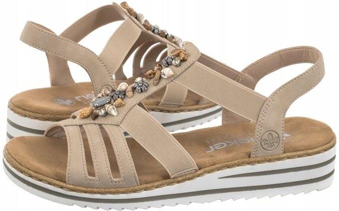 Komfortowe sandały Rieker W RKR680 beżowe Właściwości sandały marki Rieker doskonałe na letnie dni dla kobiet gumowy klin w cholewce cholewka wykonana jest ze skóry syntetycznej wyściółka jest ze skóry syntetycznej i materiału obcas 3.5 cm uniwersalna kolorystyka Kolor beżowy
