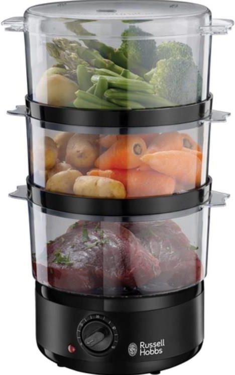 Kompaktowy parowar Matte Black - Russell Hobbs 26530-56 Jeśli uważasz, że zdrowe odżywianie to tylko sałatki, surowe warzywa i liście sałaty, zastanów się. Parowar kompaktowy Russell Hobbs dostarcza na stół smaczne posiłki – wykorzystując moc pary. Gotowanie na parze pomaga zatrzymać więcej …