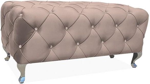 Puf Hestia Velvet beżowy Puf Hestia świetnie sprawdzi się we wnętrzach urządzonych w stylu glamour - zarówno w salonie, przedpokoju, jak i modnym butiku. Puf Hestia ma miękkie, wygodne siedzisko i aksamitną tapicerkę, która wprowadza przytulną atmosferę. Liczne pikowania zostały wykończone błyszczącymi, ozdobnymi kryształkami w białym kolorze. Dodatkowo, metalowe, srebrne nogi o misternym kształcie dodają elegancji i niebanalnego uroku. Puf zapewni dodatkowe miejsce do siedzenia dla dwóch osób. Puf Hestia został wyprodukowany w Polsce. Najważniejsze cechy: Tapicerowany aksamitem Śliczne kryształki przy pikowaniach Stylizowane nóżki Efektowny design Wyprodukowany w Polsce Dane techniczne: Nóżki: metal Kolor: srebrny Materiał: aksamit, tap. Bluvel 28 Kolor: beżowy Ilość kamyków: 54 sztuki Maksymalne obciążenie: 120 kg Wymiary: Szerokość - 50 cm Głębokość - 50 cm Wysokość całkowita - 46 cm Wysokość nóżek - 14 cm