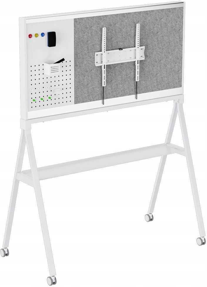 4w1 Tablica magnetyczna Suchościeralna Perforowana Uchwyt VESA Spacetronik Najważniejsze Cechy Multifunkcyjność: Tablica 4w1 – biała tablica magnetyczna, tablica perforowana, panel filcowy i uchwyt na monitor w jednym. Dwustronna powierzchnia: Możliwość jednoczesnego korzystania z obu stron w różnych celach. Magnetyczna powierzchnia: Łatwe przypinanie dokumentów i notatek za pomocą magnesów. Stabilność i mobilność: 4 kółka z blokadą pozwalają łatwo przemieszczać i zatrzymywać produkt. Półka na akcesoria: Duża przestrzeń do przechowywania narzędzi, markerów i innych elementów. Elegancki panel filcowy: Dodaje estetyki i pozwala przypinać notatki pinezkami. Solidna konstrukcja: Aluminiowa rama i stalowe elementy zapewniają trwałość na lata. 4w1 – Multifunkcyjność Wszystkie narzędzia organizacyjne masz w jednym miejscu – możesz pisać, przypinać, wieszać, prezentować i porządkować. whiteboard tablica perforowana panel filcowy uchwyt na monitor Mobilność i Stabilność Nowoczesna konstrukcja wyposażona w cztery kółka z blokadą zapewnia pełną mobilność oraz bezpieczeństwo. Łatwo przemieszczaj tablicę i zabezpiecz w miejscu jednym ruchem. Magnetyczna Powierzchnia Przypinaj dokumenty, notatki czy zdjęcia za pomocą magnesów. Półka na Wszystko W dolnej części tablicy znajduje się obszerna półka o wymiarach 132x24,4 cm, która pomieści: markery dokumenty narzędzia inne niezbędne akcesoria Uchwyt na Monitor VESA Zintegrowany uchwyt na monitor pozwala na montaż ekranu bezpośrednio na konstrukcji tablicy. zorganizuj funkcjonalną przestrzeń pracy stwórz nowoczesne stanowisko pracy w jednym systemie zaoszczędź miejsce na biurku Specyfikacja Produkt: Mobilna tablica wielofunkcyjna Spacetronik SPB230_135_60 Wymiary tablicy (SxW): 1350x610 mm Materiał: Plastik, aluminium, stal, płyta biała Funkcja magnetyczna: Tak Funkcja przechowywania: Tak, półka 1320x244 mm Kółka z blokadą: 4 sztuki Wymiary całkowite: 1414x774x1885 mm