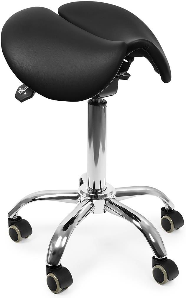 Hoker siodło regulowane Spacetronik Sella — czarnyWielogodzinna praca przy biurku bywa męcząca. Niekomfortowa pozycja może powodować problemy ze skupieniem i efektywnością. Wiele różnych badań dowodzi, że pracownik, który czuje się w pracy komfortowo, może pracować zdecydowanie wydajniej. Hokery regulowane Spacetronik Sella dzięki dzielonemu siodełku pozwalają utrzymać zdrową, neutralną pozycję ciała. Podnieś poziom ergonomii swojego stanowiska pracy. Rozwiązanie dedykowane dla każdego. Świetnie sprawdzi się dla ucznia, studenta, pracownika biurowego lub medycznego. Sposób na zdrowszą pracę — aktywne siedzenieTaboret siodłowy to bez dwóch zdań sposób na zdrowszą pracę. Stołek do biurka Spacetronik Sella umożliwia pracę lub naukę w pozycji siedzącej, a także pół-stojącej, czyli podpartej, wymuszając przy tym pracę mięśni nóg oraz brzucha. Dwuczęściowa siodełko hokera wpływa pozytywnie na zdrowie kręgosłupa, wymuszając jego odpowiednie ułożenie, a także poprawia krążenie.Zaprojektowany dla wygodyPracuj z Sella i zrelaksuj się, czerpiąc z tego szereg korzyści. Odpowiednio wyprofilowane miękkie i sprężyste siedzisko z wysokiej jakości materiałów, zapewnia wysoki komfort podczas użytkowania taboretu obrotowego.Siodło z regulacją wysokości - ergonomiaWyposaż swoje stanowisko pracy w kolejny ergonomiczny produkt. Sella to alternatywa dla standardowych foteli biurowych, w przeciwieństwie, do których zapewnia pełną swobodę ruchów. Idealnie współgra z biurkami regulowanymi.Siodło Sella to mniejszy nacisk na obszary miednicyNacisk wywoływany siedzeniem na klasycznych krzesłach źle wpływa na pracę miednicy, kości ogonowej oraz okolic narządów płciowych. Powyższe problemy mogą przyczynić się do wewnętrznych problemów zdrowotnych. Poprzez tendencyjne pochylanie się na krześle, plecy nie są proste, a to powoduje problemy z plecami. Na jednoczęściowym siodle nacisk na otwór miednicy jest jeszcze silniejszy. Odruchowo staramy się tego uniknąć, odchylając miednicę do tyłu i w rezultacie uzyskujemy zgarbioną pozycję. Jeśli ktoś już ma problemy z bólem pleców, garbienie może okazać się bolesne a rezultatem może być drętwienie spowodowane zbyt dużym naciskiem. Podczas siedzenia na dwuczęściowym krześle siodłowym, nacisk wywierany jest na kości odpowiedzialne za siedzenie, w rezultacie odciążamy tkanki miękkie, dzięki czemu możemy dłużej siedzieć w wygodnej pozycji, a krążenie pozostaje niezakłócone.Neutralna pozycja ciałaDzięki siodełkom Stella możemy w znacznym stopniu zbliżyć się do neutralnej postawy ciała, która nie wymaga siły mięśni. W latach 80. NASA opracowała Man-System Integration Standards (MSIS) który zawiera zestaw wytycznych dot. postawy człowieka w środowisku mikrograwitacji. Udowodniono, że neutralna postawa ciała minimalizuje potrzebę podparcia się, rozładowuje napięcie mięśniowo-szkieletowe i zmniejsza nacisk na przeponę i kręgosłup. W dodatku neutralna krzywizna kręgosłupa nie doświadcza naprężeń mechanicznych. Przykłady neutralnych postaw możemy zaobserwować obok. Siodło biurowe wyposażone w kółka Dzięki kółkom zamontowanym do siodła możesz zmieniać swoją pozycję szybko i przyjemnie. Taboret dla każdego Sella jest rozwiązaniem dosłownie dla każdego, niezależnie od pracy, jaką wykonuje. Dostosuj wysokość siedziska do wzrostu użytkownika dzięki dużemu zakresowi regulacji Nowoczesny design Minimalistyczny wygląd sprawia, że stołek biurowy Sella wpasuje się w każdą aranżację pomieszczenia, czy to będzie kuchnia, biuro, gabinet lub recepcja Błyskawiczny montaż Stołek do biurka Sella wymaga minimalnego montażu — po złączeniu ze sobą elementów, hoker regulowany jest gotowy do użycia Hoker z regulacją wysokości Sella - Najważniejsze cechy Gwarancja 2 lata Podnośnik gazowy klasy 3 Regulacja wysokości od 59 - 79 cm Siedzisko pokryte skórą PU wypełnione gęstą pianką Średnica podstawy 50cm Rozmiar siedziska 46x70cm Waga 9 kg Udźwig do 100 kg