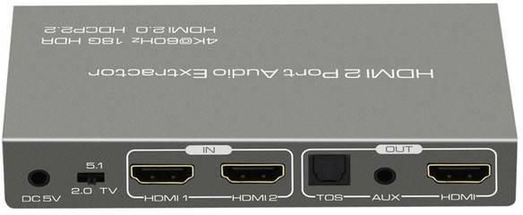 Extractor 2x HDMI-HDMI + Audio ARC 4K Spacetronik SPH-SAE06 Extractor 2x HDMI na HDMI + Audio (R/L+SPDIF) pozwala na podłączenie dwóch urządzeń wysyłających sygnał audio i video (tuner, konsola, dvd, blu-ray) do telewizora kablem HDMI. Dodatkowo można wyodrębnić sygnał audio z urządzenia i przesłać go do amplitunera kina domowego lub innego tego typu urządzenia. Dzięki takiemu rozwiązaniu dźwięk będzie słyszalny standardowo z głośników telewizora i dodatkowo z drugiego źródła po włączeniu amplitunera. Ciekawe rozwiązanie gdy chcemy panować i sami decydować kiedy dźwięk ma być słyszalny z danego urządzenia. Urządzenie posiada możliwość przełączania wejścia sygnału oraz wyjścia dźwieku 2.0; 5.1 lub TV - 2CH dla słuchawek L/R 3,5 mm lub wyjścia stereo SPDIF, - 5.1CH dla wyjścia SPDIF, - 7.1CH dla wyjścia HDMI Po wybraniu trybu kanału 5.1: - jeśli źródło wejściowe zawiera kanał 5.1 - interfejs wyjściowy SPDIF będzie przesyłał sygnał audio 5.1, podczas gdy interfejs STEREO OUT nic nie prześle. - Jeśli źródło wejściowe nie posiada interfejsu SPDIF OUT i AUDIO OUT to sygnał wyjściowy będzie 2-kanałowy - Nie można używać z innym konwerterem, takim jak np. konwerter HDMI na DVI - Zgodny z HDMI2.0, HDCP2.2 - Obsługa rozdzielczości Full HD 1080P, Full 3D, 4K * 2K przy 60 Hz, YUV 4: 4: 4 HDR - Obsługa funkcji ARC: wyjście dzwięku z kabla HDMi wejściowego i wyjściowego - Wzmacniacz AV przez HDMI Połączenie kablowe z HDTV, gdy telewizor HD odbiera dźwięk i treść wideo. - Obsługa Dolby Digital AC3, DTS, LPCM i innych cyfrowych formatów audio, obsługujących 5.1 - Prosta instalacja, Plug & Play Instrukcja bezpieczeństwa >>TUTAJ<<