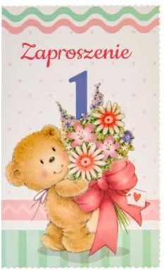 Zaproszenie Pierwsze Urodziny Miś Zaproszenie z okazji pierwszej rocznicy urodzin, z dołączoną kopertą. Rozmiar: szerokość: 9 cm wysokość: 15,5 cm