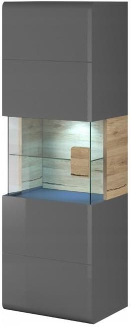 Wymiary: szerokość: 53 cm wysokość: 159 cm głębokość: 39 cm Cechy charakterystyczne produktu: nowoczesny wygląd kolorystyka antracyt połysk hartowane szkło witryny zaokrąglone fronty meble do samodzielnego montażu model dostarczany w paczkach Wykonanie produktu: korpus - płyta laminowana 15 mm …