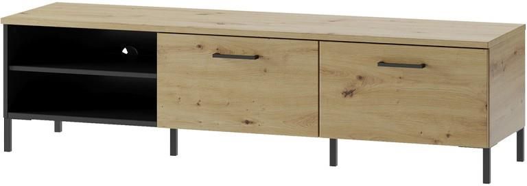 Szafka RTV Lucas 25 dąb artisan/czarny Szynaka Meble Nowoczesna szafka RTV do salonu i pokoju dziennego. Szeroki blat pozwali ustawić duży telewizor, a dolne odkryte półki pozwolą estetycznie ustawić urządzenia takie jak dekoder czy odtwarzacz DVD. Mebel posiada także dwie zamykane na klapy szafki. Front: płyta meblowa foliowana w dekorze drewnopodobnym + szkło hartowane z malowaną ramką Korpus: płyta meblowa foliowana w dekorze drewnopodobnym Nóżki: metal Kolor: czarny Wymiary: Szerokość - 155 cm Głębokość - 42 cm Wysokość - 42 cm
