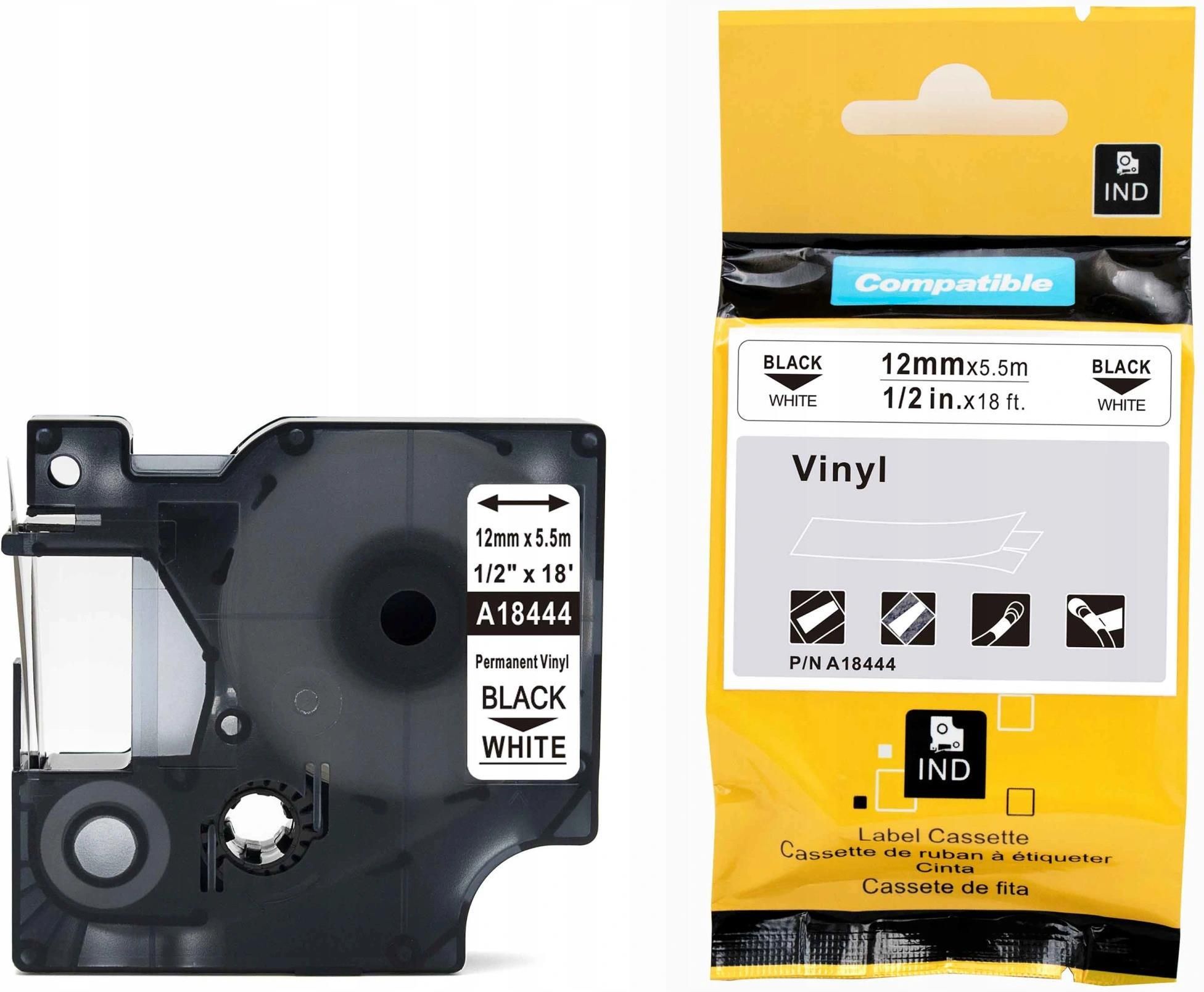 Taśma do Dymo Rhino 18444 12mm 5,5m biała Najwyższej jakości zamienniki taśm do drukarek: MODEL:(A18444)18444 taśma winylowa12mm x 5,5mbiała/czarny MATERIAŁ TAŚMY:TWORZYWO SZTUCZNE, TAŚMA WINYLOWA POWIERZCHNIA APLIKACJI:PLASTIK, METAL, PAPIER, DREWNO, SZKŁO TECHNIKA DRUKU:TERMO - TRANSFER ODPORNY NA DZIAŁANIE:WODY, OLEJU, PROMIENI UV, ŁAGODNYCH ROZPUSZCZALNIKÓW KOMPATYBILNY MIĘDZY INNYMI Z DRUKARKAMI Label Manager:LM 500TS, LM Wireless PnP, LM100, LM100+, LM110, LM120, LM120P, LM150, LM155, LM160, LM200, LM210, LM210D, LM220, LM220P, LM260, LM260P, LM280, LM300, LM350, LM360, LM360D, LM400, LM420P, LM420P, LM450, LM450D, LM500TS, LMPCII, LMPnP, Label Point:LP100, LP150, LP200, LP250, LP250, LP300, LP350, LP350, LP400, LP450, Label Writer:LW 400 Duo, LW 450 Duo, MobileLabeler1978246 Dymo Rhino- 4200, 5000, 5200, Pro6000 INNE MODELE TAŚM DYMO RHINO Taśmy Poliestrowe - permanentneKolor taśmy/Kolor nadrukuSzerokości: 9mm | 12mm | 19mm | 24mmbiały/czarny 18482 | 18483 | 18484 | A1734523metaliczny/czarny 18485 | 18486 | 18487 | 1805434przezroczsty/czarny 18508 | A622289 | A622290 | 1805433 Taśmy Nylonowe - elastyczneKolor taśmy/Kolor nadrukuSzerokości: 12mm | 19mm | 24mmbiały/czarny 18488 | 18489 | A1734524zółty/czarny 18490 | 18491 | A1734525 Taśmy winylowe - mocny klej, elastyczneKolor taśmy/Kolor nadrukuSzerokości: | 9mm | 12mm | 19mm | 24mmżółty/czarny |-------------| 18432 | 18433 | 1805431 |pomarańczowy/czarny | 18434 | 18435 | 18436 | 1805427 |czerwony/czarny | 18437 | 18438 | 18439 |--------------|biały/czarny | 18443 | 18444 | 18445 | 1805430 |zielony/czarny | 18440 | 18441 | 18442 |------------- |czarny/biały | 1805437 | 1805435 | 1805436 | 1805432 |niebieski/biały |--------------| 1805243 | 1805417 | 1805423 |zielony/biały |--------------| 1805414 | 1805420 | 1805426 |czerwony/biały |--------------| 1805416 | 1805422 | 1805429