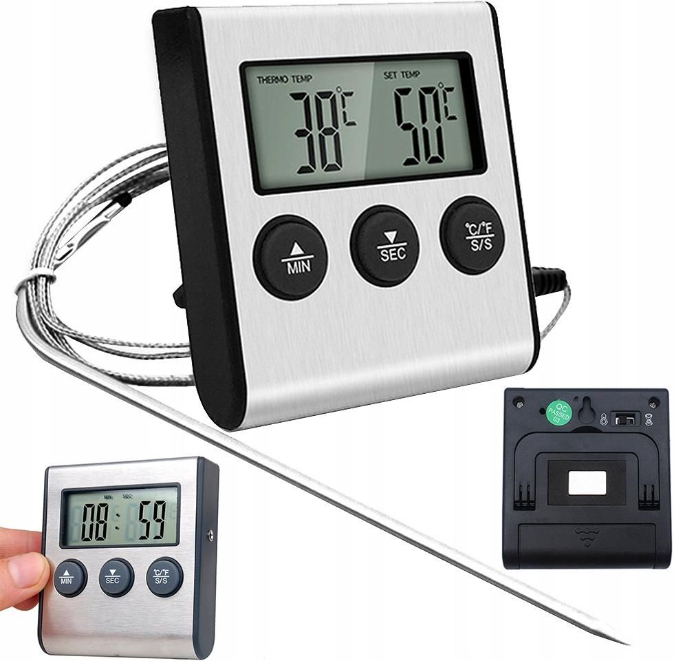 TERMOMETR Z TERMOSONDĄ DO PIECZENIA MIĘSA WĘDZARNI Elektroniczny termometr LCD służy do mierzenia temperatury mięs, cieczy, ciast, grilla itp. Pozwala on na wygodną kontrolę temperatury dowolnego produktu. Jest idealny w kuchni podczas gotowania aby sprawdzić temperaturę gotowanej potrawy. Wyświetlacz LCD, który jest łatwy do odczytu, dokładne wyświetla temperaturę w stopniach Celsjusza lub Fahrenheita. Na obudowie termometru znajduje się intuicyjny w obsłudze panel sterowania. Wyposażony w timer do 99min i 59sek. Sygnalizacja alarmem po osiągnięciu ustawionej temperatury. Posiada aż trzy opcje montażu: zawieszenia, za pomocą magnesu neodymowego i podnóżka. SPECYFIKACJA TECHNICZNA: ✅Kod produktu: 07174 ✅ Wykonany z wysokiej jakości materiałów ✅ Sonda wykonana ze stali nierdzewnej ✅ Posiada czytelny wyświetlacz LCD ✅ Mierzy temperaturę w stopniach Celsjusza lub Fahrenheita ✅ Zakres pomiarowy: od -25° C do +250° C (-13° F do 82° F) ✅ Dokładność: 1° C ✅ Minutnik ✅ Podstawka ✅ Magnes ✅ Sygnał dźwiękowy po osiągnięciu zadanej temperatury ✅ Zasilanie: 1 x bateria AAA (gratis w zestawie) ✅ Posiada przycisk ON/OFF ✅ Wymiary termometru: 6,5cm x 2,7cm x 7cm ✅ Długość sondy: 15cm ✅ Długość przewodu: ~98cm ✅ Kolor: srebrny ✅ Produkt posiada certyfikat CE ZESTAW ZAWIERA: ☑️ Fabrycznie nowy termometr ☑️ Sondę ☑️ Oryginalne opakowanie