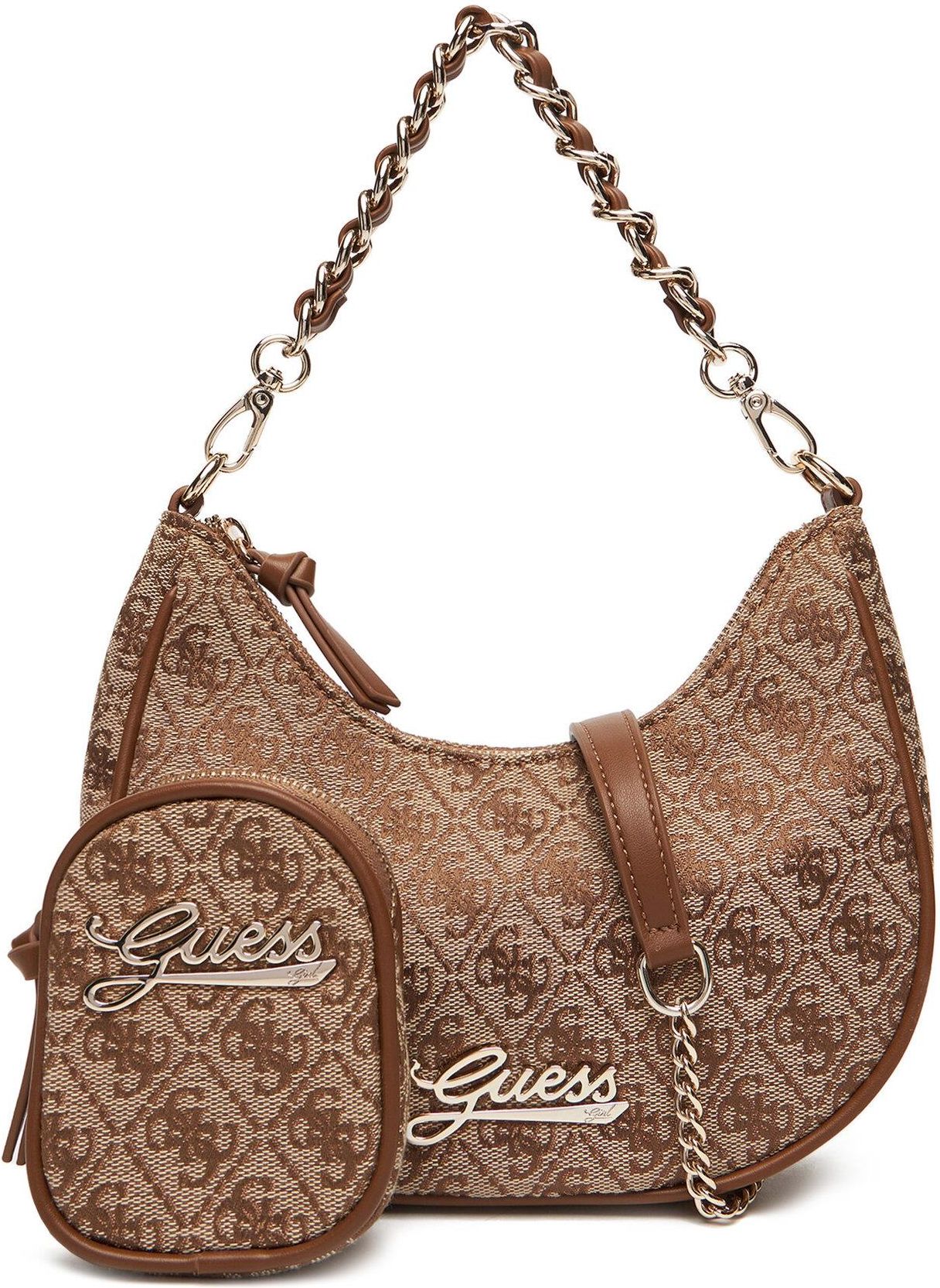 Guess Dziewczynka Torebka J5BZ09WFV20 Brązowy Mała torebka Guess to uroczy dodatek, który zachwyci każdą młodą miłośniczkę stylu. Wykonana z wysokiej jakości materiału tekstylnego, jest lekka i komfortowa w codziennym użytkowaniu. Miękka konstrukcja sprawia, że torebka doskonale dopasowuje się do potrzeb właścicielki, a praktyczne dodatki, takie jak dopinany łańcuszek i saszetka, zwiększają jej funkcjonalność. To idealny wybór dla dziewczynek, które chcą wyrazić swój wyjątkowy styl, łącząc modny wygląd z wygodą i praktycznością.