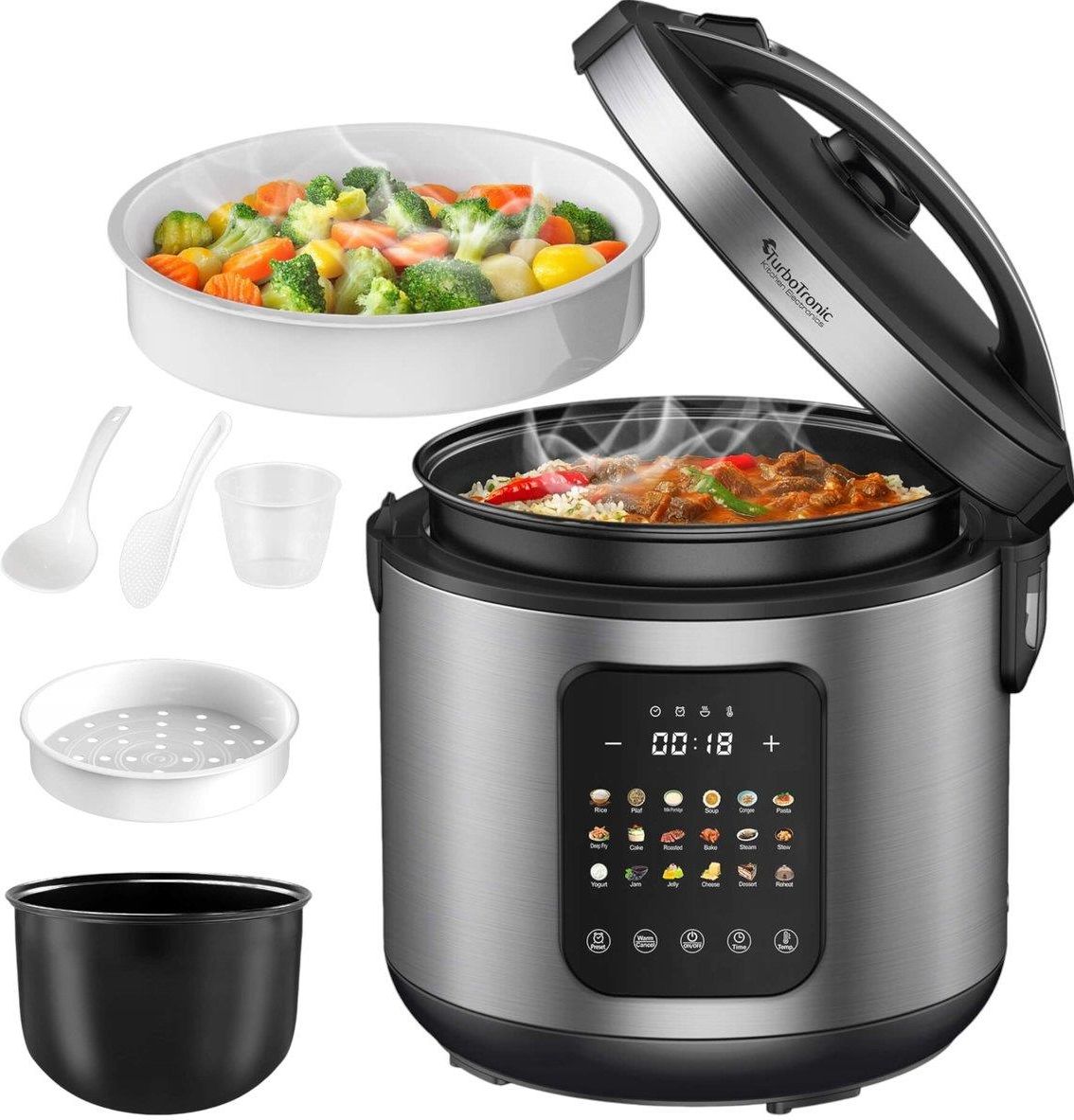 Multicooker TURBOTRONIC TT-DMC21 w eleganckim, srebrnym kolorze oferuje 18 automatycznych programów, które ułatwiają przygotowanie różnorodnych potraw. Dzięki pojemności 5 litrów, dotykowemu panelowi i bogatemu zestawowi akcesoriów, gotowanie staje się szybkie, proste i wygodne.