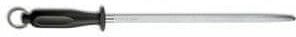 Victorinox stalka stalowa 7.8523 30 cm Ostrzałka, stalka uniwersalna Ostrzałka, stalka stalowa o owalnym przekroju. Stalka stalowa, chromowana o twardości 65 HRC Stalki stalowe nie mają właściwości ciernych więc nie ostrzą (nie ścierają stali) a jedynie prostują krawędź tnącą. Polecana do codziennego użytku do noży ze stali stosunkowo miękkiej (np. ze stali walcowanej), odradzane jest używanie tej stalki do noży ze stali o wysokiej twardości np. kutych. Najczęściej wybierana przez zawodowych kucharzy, masarzy czy rzeźników. Sposób ostrzenia Przeciągnij ostrze noża wzdłuż całej długości ostrzałki delikatnie przyciskając, następnie powtarzaj czynność po drugiej stronie ostrza noża. Czynność należy powtórzyć wiele razy na zmianę po obu stronach ostrza. WAŻNE! Należy trzymać nóż lekko pochylony pod kątem między 20 a 30 stopni w stosunku do ostrzałki. Rękojeść z polipropylenu. Długość ostrza: 30 cm Kolor rękojeści: czarny Kształt: owalny