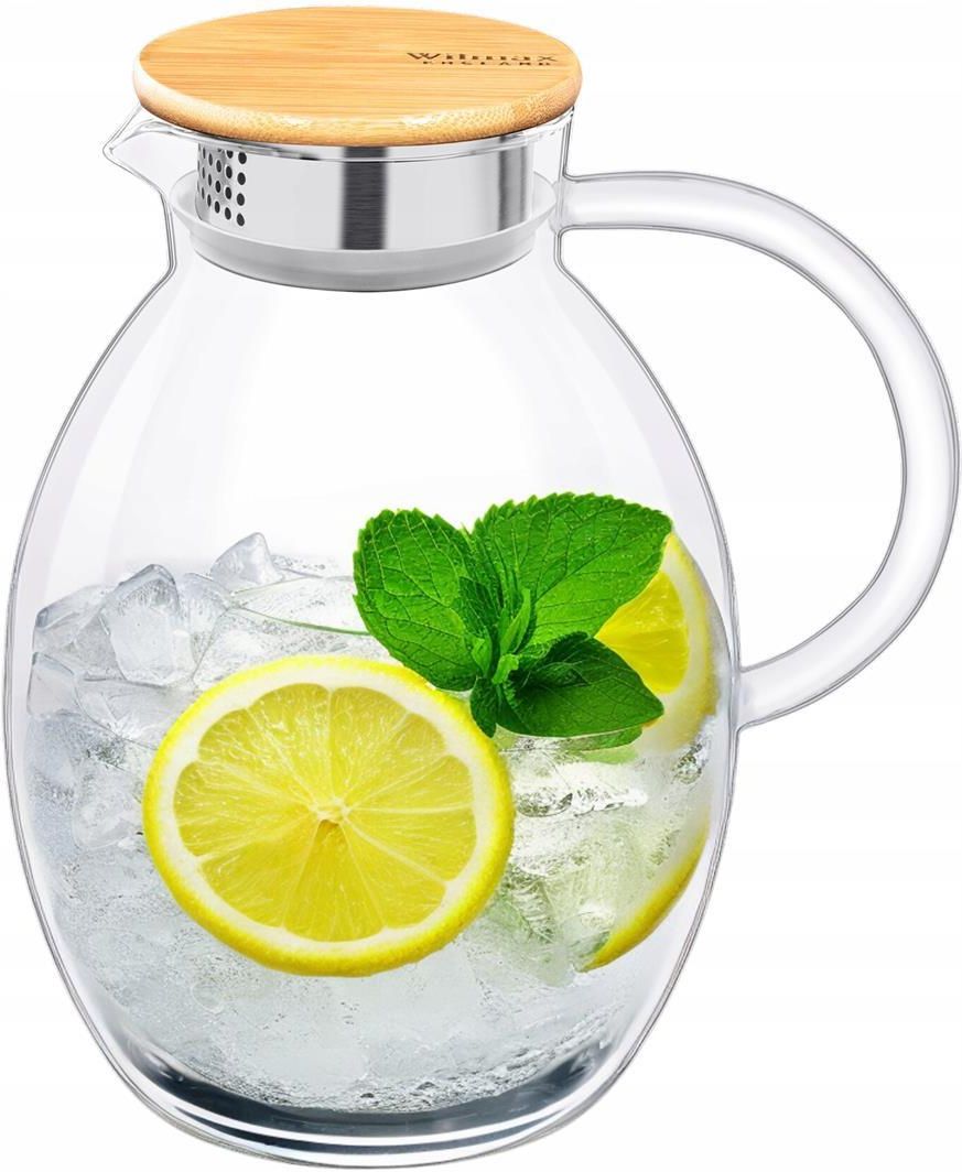 DZBANEK 2.5L WILMAX Dzbanek posiada szczelną pokrywę wykonaną ze stali nierdzewnej z uszczelką. Na stalowym kołnierzu umieszczono ograniczniki przepływu, które zatrzymają wewnątrz lód oraz kawałki owoców. Szeroki otwór ułatwia napełnianie dzbanka, jak również jego umycie. Wykonany jest z żaroodpornego szkła borokrzemowego, które jest wytrzymałe na niską (do -10ºC) oraz na wysoką temperaturę (do 100ºC). Dzbanek z powodzeniem nadaje się do używania na kuchence gazowej oraz elektrycznej (nie indukcyjnej), a bez pokrywki również w kuchence mikrofalowej. Dzbanek można myć w zmywarce natomiast pokrywkę należy myć ręcznie. Wymiary: - pojemność - 2500 ml - wysokość - 25 cm - średnica - 14,5 cm