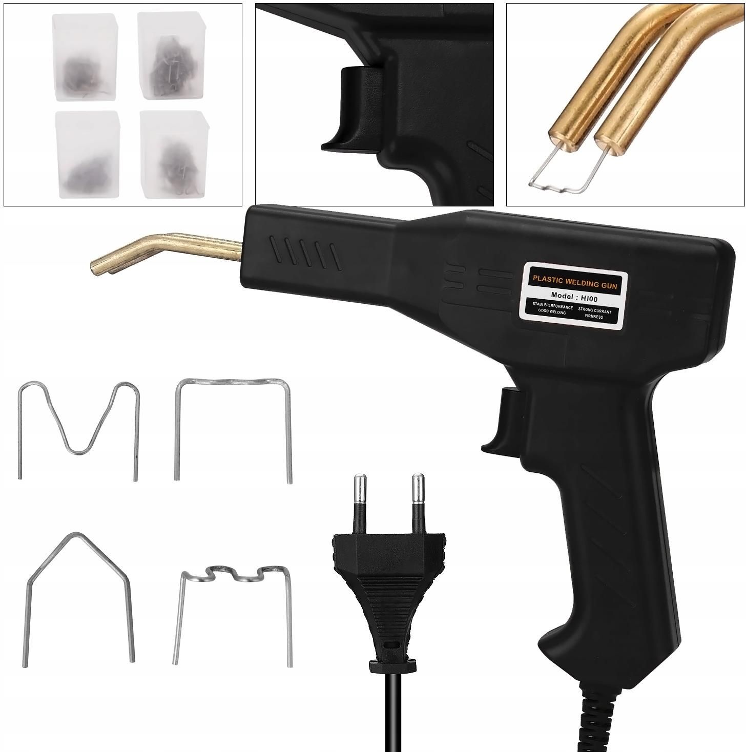 XPLA0000074 Zestaw spawarka zszywarka zgrzewarka plastiku zszywek spoiw H100. Duża moc 100W - szybkie nagrzewanie zszywek, poprawiony komfort pracy. Uniwersalna zszywarka H100 100W przeznaczona jest do napraw elementów plastikowych. Za jej pomocą dokonasz naprawy pękniętych zderzaków samochodowych, obudów sprzętu RTV, AGD, uchwytów, lamp, owiewek, tapicerki itp. Doskonale nadaje się do motoryzacji, sportu, hobby i innych zastosowań przemysłowych. Za pomocą tego urządzenia połączysz ze sobą 98% występujących na rynku plastików i tworzyw sztucznych. W zestawie 200 zszywek za pomocą których urządzenie trwale połączy ze sobą pęknięte elementy plastikowe a miejsce łączenia będzie odporne na wstrząsy i skręcanie. Urządzenie ma kształt pistoletu przez co idealnie pasuje do dłoni jak i bardzo łatwo nim operować w trudno dostępnych miejscach. W zestawie znajdują się zszywki zszywki typu "mała fala" 50szt - do prostych, najmniej wymagających połączeń. Kształt delikatnej fali wzmacnia połączenie. Nadaje się również do okrągłych przedmiotów. zszywka typu "duża fala" 50szt - do najbardziej wymagających i wytrzymałych połączeń. Jej sinosuidalny kształt zapewnia największą siłę łączenia. Nadaje się również do okrągłych przedmiotów. zszywka typu "kąt zewnętrzny"50szt - do łączenia elementów pod kątem od zewnętrznej strony. Oferuje zakres od kąta ostrego przez prosty aż do lekko rozwartego. Jednak należy pamiętać aby przygotować go przed zgrzewaniem (odpowiednio wyprofilować). zszywka typu "kąt wewnętrzny" 50szt - przystosowany do zgrzewania elementów pod kątem, od wewnętrznej strony połączenia. Dane techniczne zasilanie: 230V/0.5A moc: 100W prąd wyjściowy: 0-15A napięcie wyjściowe: 0-50V temperatura zszywek: do 400C szerokość elektrod w miejscu montażu zszywek: 13-15mm wymiary: 225x153mm wymiary walizki: 270x190mm długość przewodu zasilającego: 1,3m oświetlenie LED: tak W skład zestawu wchodzą zszywarka H100 (kolor czarny), 200 sztuk zszywek do plastików, plastikowa walizka do przechowywania. Potrzebujesz inne akcesoria lutownicze bądź serwisowe - sprawdź nasze pozostałe aukcje.
