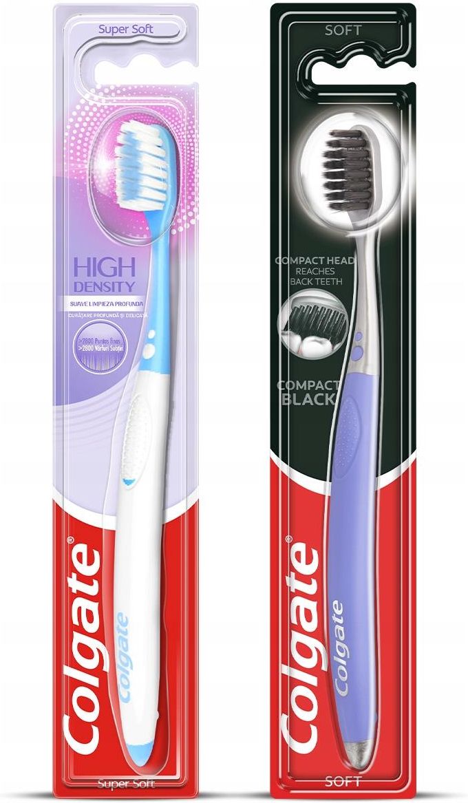Zestaw szczoteczek do zębów Colgate zawiera: szczoteczkę Colgate High Density Super Miękka - 1 szt. szczoteczkę Colgate High Density Charcoal Miękka - 1 szt. Szczoteczka do zębów Colgate High Density Gentle Gum Care z super miękkimi włóknami dla precyzyjnego i delikatnego czyszczenia zębów oraz dziąseł. Szczoteczka do zębów Colgate High Density Gentle Gum Care z super miękkimi włóknami dla precyzyjnego i delikatnego czyszczenia zębów i dziąseł. Szczoteczka posiada ponad 2800 włókien High Density o dużym zagęszczeniu dla precyzyjnego czyszczenia. Mała, kompaktowa główka* szczoteczki ułatwia dostęp do trudno dostępnych tylnych zębów. Szczoteczka jest odpowiednia dla wrażliwych zębów i dziąseł. Dentyści i higieniści rekomendują wymianę szczoteczki co 3 miesiące. *w porównaniu do zwykłych szczoteczek Colgate. Szczoteczka do zębów Colgate High Density Gentle Gum Care: 1. Super miękkie włókna. 2. Duże zagęszczenie włókien High Density - ponad 2800 włókien o cienkich końcówkach. 3. Delikatna dla dziąseł. 4. Mała, kompaktowa główka w porównaniu do zwykłych szczoteczek Colgate, dla łatwego dostępu do tylnych zębów. Szczoteczka do zębów Colgate High Density Charcoal z miękkimi włóknami nasyconymi aktywnym węglem, dla precyzyjnego i dokładnego czyszczenia zębów i dziąseł. Szczoteczka posiada włókna High Density o 10x cieńszych końcówkach włókien dla dokładniejszego czyszczenia*. Mała, kompaktowa główka** szczoteczki ułatwia dostęp do trudno dostępnych tylnych zębów. Szczoteczka jest odpowiednia dla wrażliwych zębów i dziąseł. Dentyści i higieniści rekomendują wymianę szczoteczki co 3 miesiące. *w porównaniu ze zwykłą szczoteczką z zaokrąglonymi włóknami. **w porównaniu do zwykłych szczoteczek Colgate. Szczoteczka do zębów Colgate High Density Charcoal: 1. Miękkie włókna 2. Włókna nasycone aktywnym węglem. 3. Precyzyjne i dokładne czyszczenia zębów i dziąseł. 4. Włókna High Density o 10x cieńszych końcówkach dla dokładniejszego czyszczenia w porównaniu ze zwykłą szczoteczką z zaokrąglonymi włóknami. 5. Mała, kompaktowa główka w porównaniu do zwykłych szczoteczek Colgate, dla łatwego dostępu do tylnych zębów. Kiedy wymienić szczoteczkę do zębów? Jest przynajmniej kilka dobrych powodów, by często i regularnie wymieniać szczoteczkę na nową: 1. Po każdej infekcji górnych dróg oddechowych lub infekcji jamy ustnej, aby uniknąć ryzyka ponownego zakażenia. 2. Po trzech miesiącach używania, bo na powierzchni włókien szczoteczki gromadzą się bakterie. 3. Gdy odkształcą się włókna szczoteczki, ponieważ traci ona wówczas swoje właściwości. Prawdopodobnie najlepszy moment na wymianę Twojej starej szczoteczki do zębów już był. Drugi najlepszy jest teraz. Wypróbuj też inne produkty Colgate Bielsze zęby, ochrona przed próchnicą, świeży oddech? Używaj szczoteczki COLGATE MAX WHITE wraz z innymi produktami Colgate, aby skutecznie czyścić zęby, usuwać płytkę nazębną oraz zwalczać bakterie, które gromadzą się na zębach, języku, dziąsłach i policzkach. Poznaj cały system Colgate dla kompleksowej higieny jamy ustnej: ● szczoteczka do zębów ● pasta do zębów ● płyn do płukania jamy ustnej ● nici dentystyczne