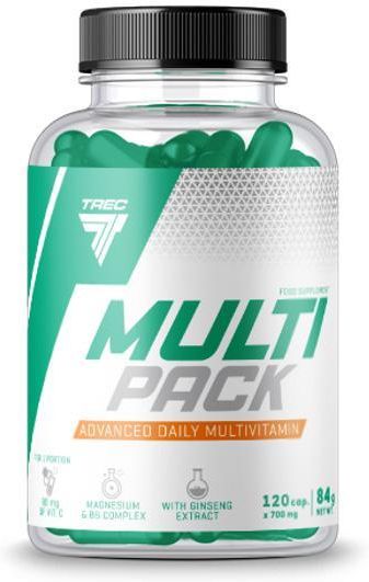 Trec kompleks witamin i minerałówKompleks MULTIPACK to zbiór witamin, minerałów oraz aktywatorów metabolicznych w 120 kapsułkach, idealny dla osób aktywnych fizycznie i umysłowo. Zapewnia wsparcie dla organizmu, który może odczuwać zwiększone zapotrzebowanie na te składniki z powodu stresu, niewłaściwej diety czy intensywnych treningów.Działanie poszczególnych składnikówMagnez: Pomaga w prawidłowej pracy mięśni, a także przyczynia się do zmniejszenia uczucia zmęczenia i znużenia.Żelazo: Wspomaga redukcję zmęczenia i znużenia.Witamina D: Przyczynia się do utrzymania zdrowych kości.Niacyna (witamina B3): Wspiera prawidłowe funkcjonowanie układu nerwowego.Cynk: Pomaga w utrzymaniu prawidłowego poziomu testosteronu we krwi.Witaminy z grupy B (tiamina, B6, ryboflawina, B12): Wspomagają metabolizm energetyczny oraz funkcjonowanie układu nerwowego.Witaminy A, C i D: Przyczyniają się do prawidłowego działania układu odpornościowego.Witamina E: Chroni komórki przed stresem oksydacyjnym.Jod i selen: Wspierają prawidłową pracę tarczycy.Sposób użyciaZaleca się przyjmowanie 1 kapsułki dwa razy dziennie, najlepiej po posiłku, popijając około 300 ml wody. Nie należy stosować preparatu dłużej niż 3 miesiące i nie przekraczać zalecanej dziennej porcji.Ważne informacjeProdukt jest przeznaczony dla dorosłych i nie może być stosowany jako zamiennik zróżnicowanej diety. Preparat nie jest przeznaczony dla dzieci, kobiet w ciąży ani karmiących piersią. Dla zachowania pełni zdrowia zaleca się zrównoważoną dietę i zdrowy tryb życia.Przechowywać w suchym, zamkniętym opakowaniu, w temperaturze 15–25°C, z dala od małych dzieci, światła i wilgoci. Po otwarciu należy spożyć w ciągu 3 miesięcy. Datę minimalnej trwałości oraz numer partii produkcyjnej znajdziesz na spodzie opakowania.