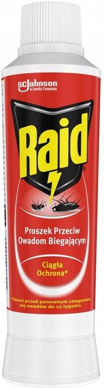 Raid proszek na owady biegająceRaid w formie proszku to skuteczny środek owadobójczy, przeznaczony do zwalczania najczęściej występujących owadów biegających w domu i jego otoczeniu.Produkt działa natychmiastowo na dorosłe osobniki takich gatunków jak:Mrówki (Lasius niger).Prusaki (Periplaneta americana).Karaluchy (Blattella germanica).Efekt działania preparatu utrzymuje się nawet do 3 miesięcy po zastosowaniu, zapewniając długotrwałą ochronę.Środki ostrożnościUsunąć lub przykryć teraria, akwaria, klatki ze zwierzętami i zbiorniki na wodę.Produkt stosować w miejscu niedostępnym dla dzieci i zwierząt niebędących przedmiotem zwalczania (zwłaszcza psów, kotów).Zapewnić odpowiednią wentylację w czasie stosowania produktu.Rozmieszczać produkt w miejscach suchych, zabezpieczonych przed wilgocią, zalaniem, zmywaniem i działaniem warunków atmosferycznych.Produkt nie jest przeznaczony do mieszania z innymi produktami biobójczymi.Nie stosować na zwierzętach.Po zastosowaniu produktu oraz przed jedzeniem, piciem i paleniem tytoniu umyć ręce i skórę narażoną na bezpośredni z nim kontakt oraz uprać zanieczyszczoną odzież.Nie stosować produktu w miejscach, w których może on mieć kontakt z żywnością, wodą przeznaczoną do spożycia, paszą, przyborami mającymi kontakt z żywnością.Po zakończeniu dezynsekcji usunąć produkt.Substancja czynna: deltametryna 0,05g/100g. Działa bardzo toksycznie na organizmy wodne, powodując długotrwałe skutki. Chronić przed dziećmi. Zebrać wyciek. Zawartość/pojemnik usuwać do miejsc przeznaczonych do składowania i utylizacji odpadów zgodnie z lokalnymi przepisami.