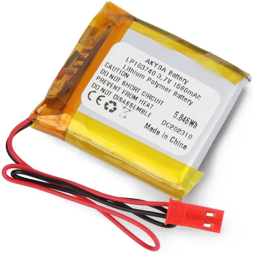 Akumulator Li-Pol firmy Akyga o napięciu znamionowym 3,7 V i pojemności 1580 mAh. Wyróżnia go wysoka gęstość energii oraz powolne tempo samoistnego rozładowywania. Posiada wbudowane zabezpieczenie PCM, które chroni przed nadmiernym rozładowaniem i przeładowaniem. Akumulator jest wyposażony w przewód o długości 150 mm z żeńskim konektorem o rozstawie wyprowadzeń 2,54 mm.
