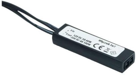 Włącznik meblowy do Led zbliżeniowy bezdotykowy 3w1 czarny IDL Włącznik szafkowy Led 3w1, włącznik drzwiowy, włącznik bezdotykowy oraz ściemniacz Led na napięcie DC12V i 24V o maksymalnym obciążeniu 5A dla 12V i 4A dla 24V . Włącznik do Led z funkcją włącznika bezdotykowego na machnięcie ręką ze ściemniaczem, można go przełączyć w tryb jako włącznik do drzwi szafek, lub włącznik do szuflady. Włącznik zapala światło po otwarciu drzwi oraz gasi światło w momencie zamknięcia drzwi szafki lub szuflady. Zakres odległości dla prawidłowego działania czujnika to około 10cm. Włącznik posiada przewody zasilania DC, oraz wyjścia sygnałowe DC o długości około 100cm, zakończone odpowiednio gniazdem oraz wtykiem Amp JST 2 pin. Podstawowe zalety włącznika 3w1: trzy tryby pracy, małe wymiary, łatwy montaż, współpracuje z oświetleniem Led na 12V oraz 24V, szybkozłącza na wejściu i wyjściu typu JST 2-pin. Podstawowe zastosowanie włącznika 3w1: włącznik do oświetlenia podszafkowego w kuchni, włącznik do oświetlenia w szafach z otwieranymi drzwiami, włącznik oświetlenia w szafach z drzwiami przesuwnymi, włącznik do oświetlenia Led w szufladach, ściemniacz do oświetlenia Led montowanego w meblach. Podstawowe parametry włącznika 3w1: napięcie zasilania: DC12V - DC24V, maksymalna moc znamionowa włącznika: 5A maksymalne obciążenie włącznika przy 12V: 60 Watt, maksymalne obciążenie włącznika przy 24V: 100 Watt tryby pracy: włącznik bezdotykowy, włącznik zbliżeniowy, ściemniacz PWM, czujnik ruchu-odległości: IR - podczerwień odległość działania czujnika: od 5 cm do 8 cm, długość przewodów na wejściu zasilania: 150 cm, długość przewodów na wyjściu do Led: 180 cm, gniazdo na wejściu zasilania: JST 2-pin AMP, wtyk na wyjściu do Led: JST 2-pin AMP. wymiary włącznika (dł. x szer. x wys.): 48mm x 14mm x 7mm Uwagi: funkcje przełącznika zmieniamy przed włączeniem zasilania, przełącznik przesuwamy cienkim przedmiotem np. igła. Zasada działania w zależności od ustawienia przełącznika: 1. Funkcja włącznik sensor do drzwi/szuflad załącza obwód elektryczny w momencie np. otwarcia drzwi szafy i wyłącza je po zamknięciu drzwi. 2. Funkcja włącznik bezdotykowy ze ściemniaczem załącza i wyłącza obwód elektryczny w momencie zbliżenia oraz ściemnia i rozjaśnia gdy przytrzymamy rękę przed sensorem. 3. Funkcja włącznik bezdotykowy załącza obwód elektryczny w momencie zbliżenia ręki.