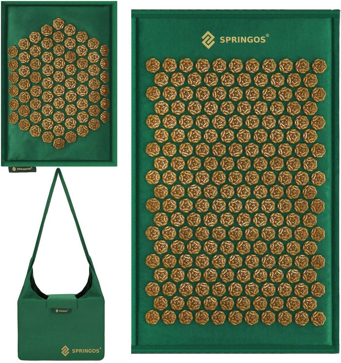 ZESTAW MATA + PODUSZKA DO AKUPRESURY Z POKROWCEM Marka: Springos® Kolor: ciemnozielony, matowe złoto Materiał: 100% len, ABS, wypełnienie - włókno kokosowe W zestawie: mata, poduszka, torba do przechowywania Wymiary maty: 65 x 40 cm Wymiary poduszki: 40 x 29 cm Zdejmowalne powłoczki maty i poduszki …