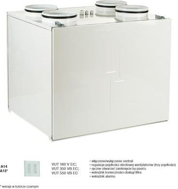 Zastosowanie Centrale wentylacyjne to kompletne urządzenia wentylacyjne zapewniające filtrację i dopływ świeżego powietrza do pomieszczeń, a także usuwanie powietrza zanieczyszczonego. Równocześnie powietrze wywiewane ogrzewa świeże powietrze nawiewane na drodze wymiany ciepła w wymienniku płytowym przeciwprądowym, o wysokiej efektywności odzysku ciepła. To energooszczędne rozwiązanie dla domów prywatnych i mieszkań. Wszystkie modele przeznaczone są do łączenia z okrągłymi przewodami wentylacyjnymi. Obudowa Obudowa centrali wykonana jest z wysokiej jakości stali z powłoką polimerową z wewnętrzną izolacją termiczną i akustyczną z wełny mineralnej o grubości 20mm. Filtr Centrala wentylacyjna wyposażona jest w filtry płytowe o klasie filtracji G4. Opcjonalnie można zastosować filtry o klasie filtracji F7. Wentylatory Zastosowane zostały silniki elektro komutatorowe prądu stałego (EC) o wysokiej sprawności, wyposażone w zewnętrzny wirnik i wygięte do tyłu łopatki. Tego typu silniki są na dzień dzisiejszy najbardziej innowacyjnym rozwiązaniem w dziedzinie oszczędzania energii. Silniki EC zapewniają wysoką wydajność i regulację w pełnym zakresie prędkości obrotowej wentylatora. Niewątpliwą zaletą silnika EC jest jego wysoki współczynnik KPD (do 90%). Wymiennik ciepła W centralach wentylacyjnych zastosowano polistyrenowy wymiennik przeciwprądowy o wysokiej efektywności wymiany ciepła. Pod blokiem rekuperatora znajduje się taca ociekowa, której zadaniem jest zbieranie i odprowadzanie kondensatu. Centrala wyposażona jest w system zabezpieczający urządzenie przed zamarznięciem. Czujnik temperatury może spowodować zatrzymanie wentylatora nawiewnego. Wymiennik można łatwo wyjąć w celu jego oczyszczenia. Bypass Modele VUT 350 i 550 VB EC wyposażone są w by-pass, zapewniający w razie potrzeby możliwość schłodzenia pomieszczenia dzięki bezpośredniemu dopływowi chłodnego powietrza do pomieszczeń z zewnątrz. Centrala dostęna w wersjach z dwoma rodzajami sterownika A14 A11 Ostatnia część symbolu poszczególnych modeli określa, który sterownik jest na wyposażeniu centrali VUT V EC