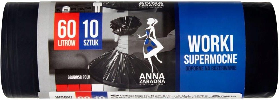 Worki na śmieci SUPERMOCNE 60L 1op.-10szt. czarne Ekologiczne, czarne worki na śmieci do pakowania odpadów i śmieci. Supermocne worki na śmieci są wykonane z grubej folii LDPE z regranulatu, dzięki czemu są wytrzymałe na obciążenia i przypadkowe rozdarcia. Worki posiadają tzw. gwieździsty zgrzew dna, dzięki czemu dno worka jest niezwykle szczelne a same worki świetnie pasują do okrągłych śmietników. Idealnie sprawdzają się w domu, biurach, miejscach publicznych. Pasują do większości pojemników na odpady. Opakowanie zawiera 10 sztuk worków o pojemności 60 L z tradycyjnym zamknięciem. Informacje Seria STELLA - Anna Zaradna
