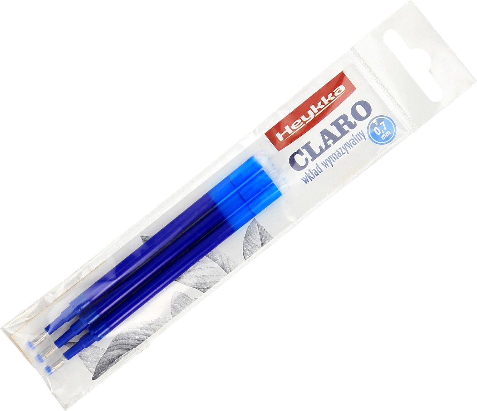 Wkłady termościeralne do długopisów marki Heykka. Kolor: niebieski Średnica kulki piszącej: 0.7 mm Uniwersalne wkłady do długopisów Claro Ilość: 3 szt.