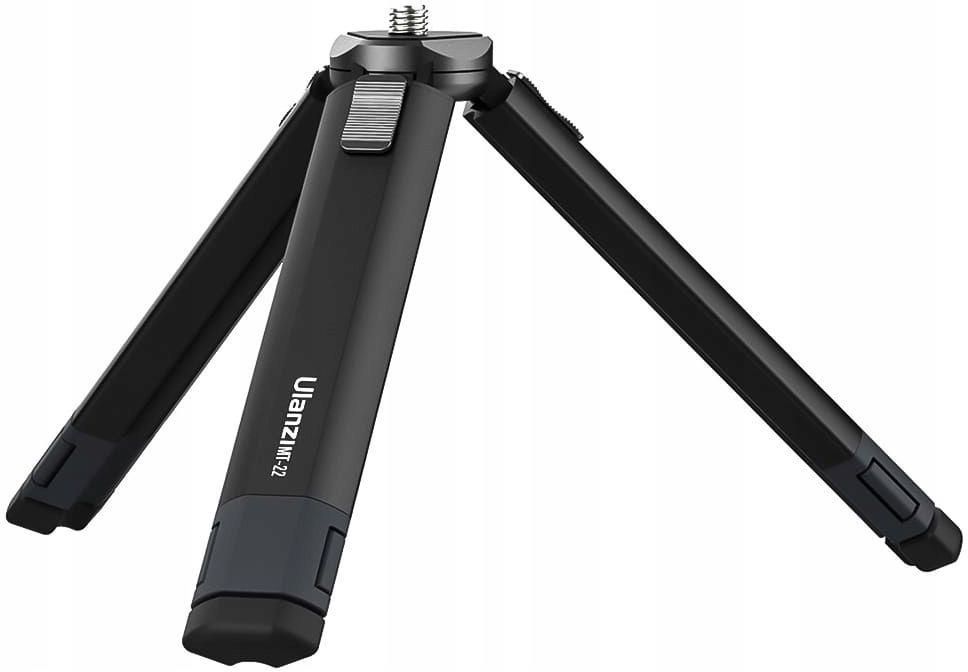 Ulanzi MT-22 Solidny aluminiowy statyw Solidny Udźwignie nawet 2,5 kilograma, więc poradzi sobie całym zestawem do vlogowania lub fotografowania. Jest solidny, ponieważ wykonany z lotniczego stopu aluminium. Jest kompaktowy. Złożony mierzy 15 centymetrów, a po wyciągnięciu nóżek 21,3 centymetra. Zalety: Posiada dwu stopniową regulację wysokości nóżek. Może być używany jako statyw lub uchwyt ręczny. Ma szeroko rozstawiane antypoślizgowe nóżki. Kompaktowe rozmiary. Złożony mierzy 15 centymetrów i waży tylko 198 gramów. Zamontujesz na nim wiele urządzeń, ponieważ posiada mocowanie na standardowy gwint 1/4 cala. Może pracować solo (bez dodatkowej głowicy), a zabezpieczający silikon wokół śruby zapewnia ochronę kamery przed porysowaniem. Jest solidny, bo wykonany z lotniczego aluminiowego stopu. Specyfikacja: Marka: Ulanzi. Model: MT-22. Rozstaw nóżek: 40° - 75°. Mocowanie: gwint 1/4″. Udźwig: do 2,5 kg. Wysokość statywu (zakres pracy): 4,3 – 15,6 cm. Długość: 15 cm (złożony), 21,3 cm (wysunięte stopki). Materiał: aluminium, ABS, silikon. Waga: 198 g. Waga wraz z opakowaniem: 228 g.