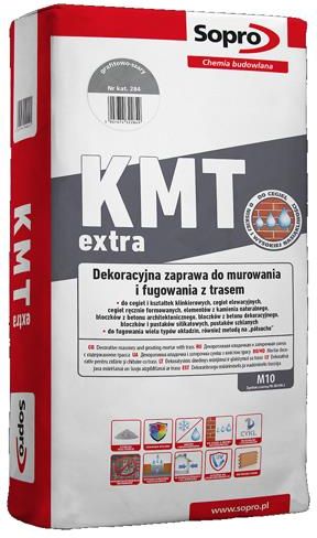 ZAPRAWA KMT EXTRA 284 GRAFITOWO-SZARY 25KG SOPRO Odpowiednik koloru KMT 258 Hydraulicznie wiążąca zaprawa cementowa ogólnego przeznaczenia, z dodatkiem trasu reńskiego, do dekoracyjnego murowania i fugowania w jednej operacji murów z cegieł i kształtek klinkierowych o niskiej i wysokiej nasiąkliwości, cegieł elewacyjnych, cegieł ręcznie formowanych, elementów z kamienia naturalnego, bloczków z betonu architektonicznego, bloczków z betonu dekoracyjnego, bloczków i pustaków silikatowych, pustaków szklanych. Do fugowania ściennych okładzin z płytek klinkierowych, elewacyjnych, ręcznie formowanych, kamiennych i betonowych przy głębokości spoiny ?10 mm. Klasa wytrzymałości na ściskanie M10 wg normy PN-EN 998-2 Wysoka zawartość trasu reńskiego Uniwersalna zaprawa do wielu typów okładzin Do murowania i spoinowania w jednym cyklu pracy Do fugowania różnego typu okładzin Do spoinowania metodą na półsucho Wysoka odporność na warunki atmosferyczne Szeroki zakres zastosowań Paroprzepuszczalna Odporna na UV Zwiększona przyczepność Radykalnie zmniejsza ryzyko powstawania wykwitów wapiennych Trwała kolorystyka Produkt o niskiej zawartości chromianów zgodnie z Rozporządzeniem (WE) Nr 1907/2006, załącznik XVII