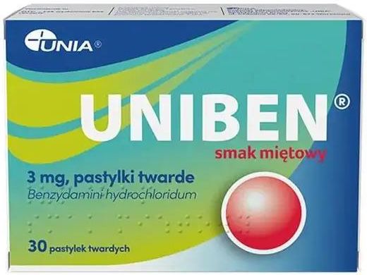 Uniben smak miętowy, to lek w postaci pastylek do ssania, stosowany w leczeniu bólu, obrzęku oraz zaczerwienienia, które towarzyszą stanom zapalnym jamy ustnej i gardła. Uniben smak miętowy, wykazuje działanie przeciwzapalne i przeciwbólowe oraz działa miejscowo znieczulająco i odkażająco. Wskazania do stosowania: Lek stosuje się do leczenia dolegliwości i objawów (ból, zaczerwienienie, obrzęk) związanych ze stanami zapalnymi jamy ustnej i gardła. Skład: Substancją czynną leku jest benzydaminy chlorowodorek (Benzydamini hydrochloridum). Jedna pastylka twarda zawiera 3 mg benzydaminy chlorowodorku (Benzydamini hydrochloridum), co odpowiada 2,68 mg benzydaminy. Substancje pomocnicze: izomalt (E 953); lewomentol; aspartam (E 951); kwas cytrynowy jednowodny (E 330); naturalny aromat cytrynowy (WONF) (zawiera m.in. d-limonen i cytral); olejek eteryczny mięty polnej z obniżoną zawartością mentolu; olejek eteryczny eukaliptusowy; żółcień chinolinowa (E 104); indygotyna (E 132). Działanie: Uniben smak miętowy zawiera jako substancję czynną benzydaminę, która działa przeciwzapalnie i przeciwbólowo, a także miejscowo znieczula oraz odkaża. Dawkowanie: Ten lek należy zawsze stosować dokładnie tak, jak to opisano w ulotce dla pacjenta lub według zaleceń lekarza lub farmaceuty. W razie wątpliwości należy zwrócić się do lekarza lub farmaceuty. Uniben smak miętowy należy powoli rozpuszczać w ustach. Pastylkę należy ssać powoli. Nie połykać i nie żuć. Dorośli: 3 pastylki na dobę. U dzieci (6 - 11 lat) ze względu na ryzyko zakrztuszenia, lek powinien być stosowany pod nadzorem osoby dorosłej. Osoby dorosłe i dzieci w wieku powyżej 6 lat: 1 pastylka 3 razy na dobę. Działania niepożądane: Jak każdy lek, lek ten może powodować działania niepożądane, chociaż nie u każdego one wystąpią. Niezbyt często występujące działania niepożądane (u 1 na 100 do 1 na 1000 osób): reakcje skórne w wyniku nad wrażliwości na światło. Rzadko występujące działania niepożądane (u 1 na 1000 osób): pieczenie lub suchość w jamie ustnej. W razie wystąpienia tych objawów, można je zmniejszyć wypijając szklankę wody po ssaniu pastylki. Bardzo rzadko występujące działania niepożądane (u 1 na 10000 osób): skurcz krtani, obrzęk naczynioruchowy. Działania niepożądane o nieznanej częstości: przedwczesne zamknięcie przewodu tętniczego u płodu, reakcja alergiczna (nadwrażliwość), ciężka reakcja alergiczna (wstrząs anafilaktyczny), niedoczulica jamy ustnej (miejscowa utrata wrażliwości błony śluzowej jamy ustnej). Interakcje: Należy powiedzieć lekarzowi lub farmaceucie o wszystkich lekach przyjmowanych przez pacjenta obecnie lub ostatnio, a także o lekach, które pacjent planuje przyjmować, w tym również o tych, które wydawane są bez recepty. Jeśli pacjentka jest w ciąży lub karmi piersią, przypuszcza, że może być w ciąży lub planuje mieć dziecko powinna poradzić się lekarza lub farmaceuty przed zastosowaniem tego leku. Leku Uniben smak miętowy nie należy stosować w czasie ciąży oraz w okresie karmienia piersią. Leku Uniben nie należy stosować u dzieci w wieku poniżej 6 lat ze względu na postać pastylek twardych i związane z tym ryzyko zakrztuszenia. Z tego względu u dzieci w wieku od 6 do 11 lat lek powinien być stosowany pod kontrolą osoby dorosłej. Przeciwwskazania: Nie należy stosować leku Uniben smak miętowy, jeśli: pacjent ma uczulenie na substancję czynną lub którykolwiek z pozostałych składników tego leku; u pacjentów z fenyloketonurią, ponieważ lek zawiera aspartam, który jest źródłem fenyloalaniny. Ostrzeżenia i środki ostrożności: Nie zaleca się stosowania leku jeśli pacjent ma alergię na kwas acetylosalicylowy lub inne niesteroidowe leki przeciwzapalne (NLPZ). Należy skonsultować się z lekarzem jeśli występuje/występowała astma oskrzelowa, gdyż lek Tantum Verde miodowo-pomarańczowy może nasilać duszność. W przypadku, gdy objawy stanu zapalnego (np. owrzodzenie) utrzymują się dłużej niż 3 dni należy skontaktować się z lekarzem, gdyż mogą to być symptomy innej choroby. Produkt leczniczy zawiera izomalt - rodzaj cukru. Jeżeli stwierdzono wcześniej u pacjenta nietolerancję niektórych cukrów, pacjent powinien skontaktować się z lekarzem przed przyjęciem leku. Produkt leczniczy zawiera aspartam, źródło fenyloalaniny. Może być szkodliwy dla pacjentów z fenyloketonurią. Lek należy przechowywać w miejscu niewidocznym i niedostępnym dla dzieci, w temperaturze poniżej 25°C Producent: Zakłady Farmaceutyczne „UNIA” Spółdzielnia Pracy Chłodna 56/60 00-872 Warszawa unia@uniapharm.pl