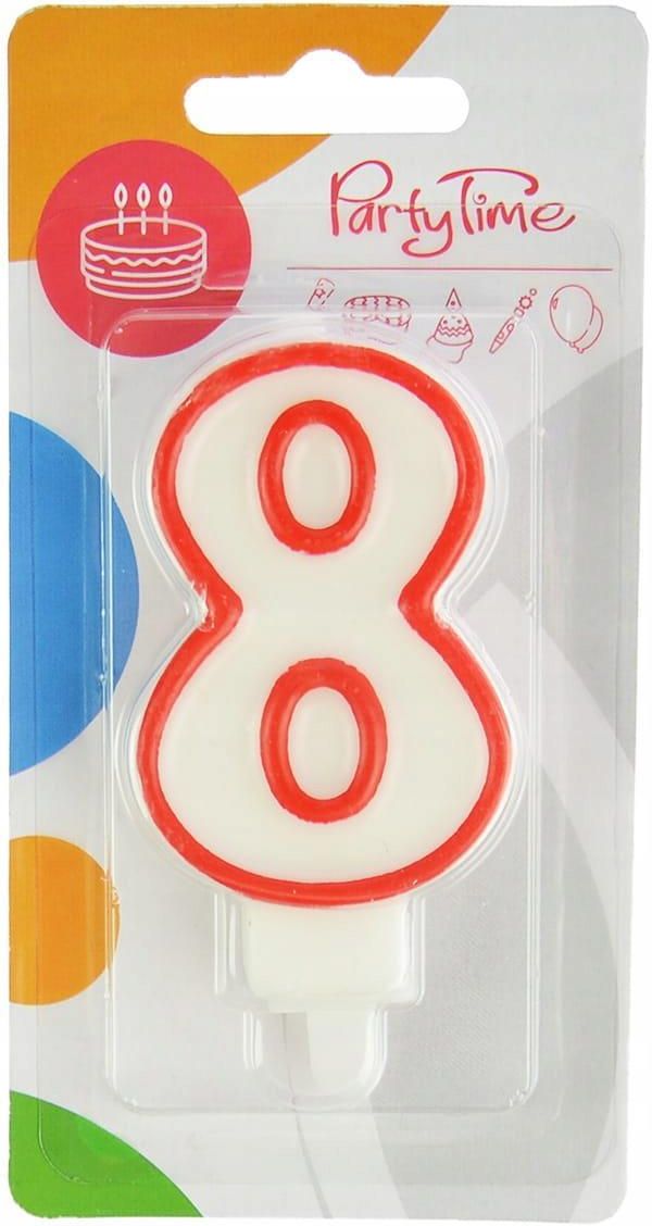 Producent: ArpexWymiar: 7,5cmŚwieczka w kształcie cyfry "8" o wysokości 7,5 cm, biała z czerwoną obramówką. Idealna do dekoracji tortów urodzinowych i jubileuszowych, dodając uroku i elegancji każdej okazji. Wyposażona w wygodny patyczek do łatwego umieszczenia na torcie.