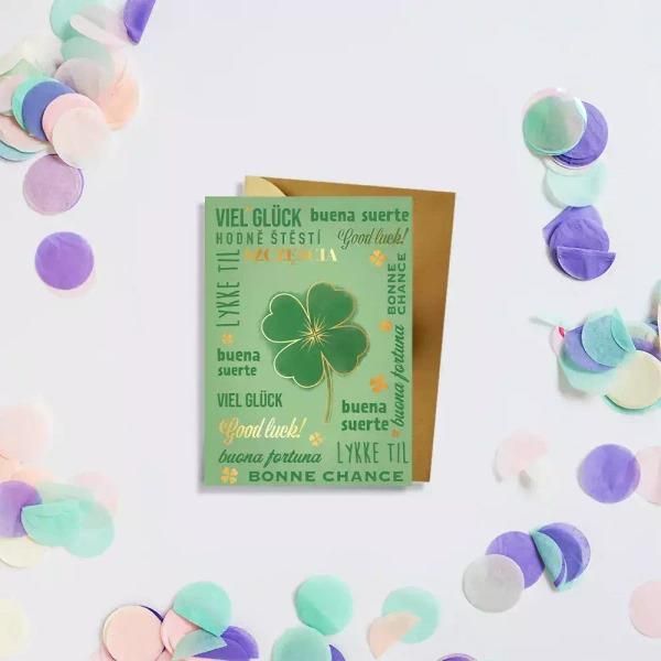 Mini Karnet B8 Duża koniczyna w formacie 11,6 x 8,1 cm, złożony 5,8 x 8,1 cm. Wydrukowany na wysokiej jakości papierze, uszlachetniony złotem. Mini karnet zamknięty w woreczek foliowy z kopertą. EAN: 5908451980368