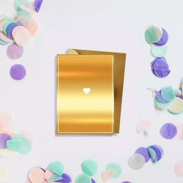 Mini Karnet B8 Serce i kropka w formacie 11,6 x 8,1 cm, złożony 5,8 x 8,1 cm. Wydrukowany na wysokiej jakości papierze, uszlachetniony złotem. Mini karnet zamknięty w woreczek foliowy z kopertą. EAN: 5908451980351