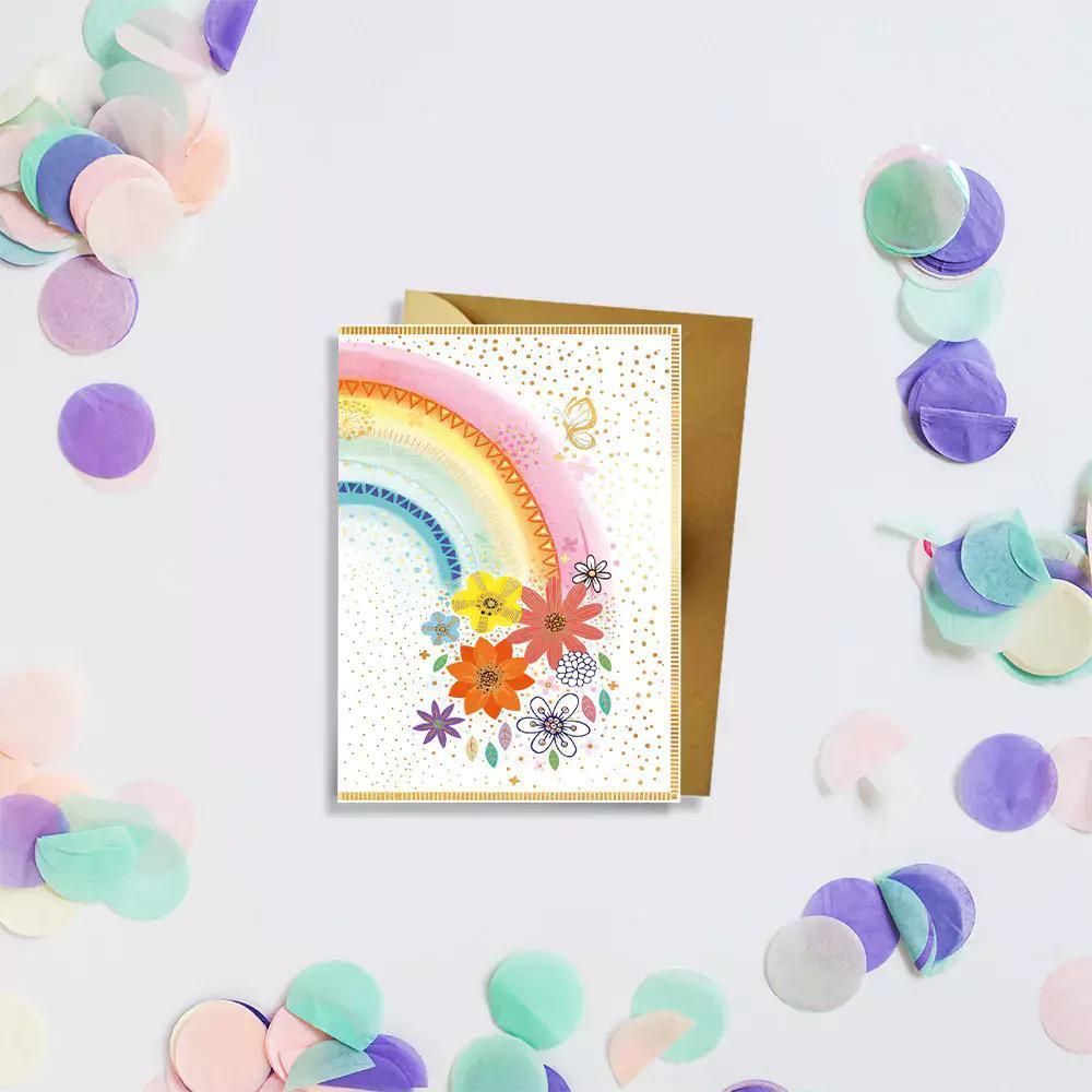 Mini Karnet B8 Tęcza z kwiatami w formacie 11,6 x 8,1 cm, złożony 5,8 x 8,1 cm. Wydrukowany na wysokiej jakości papierze, uszlachetniony złotem. Mini karnet zamknięty w woreczek foliowy z kopertą. EAN: 5908451980399