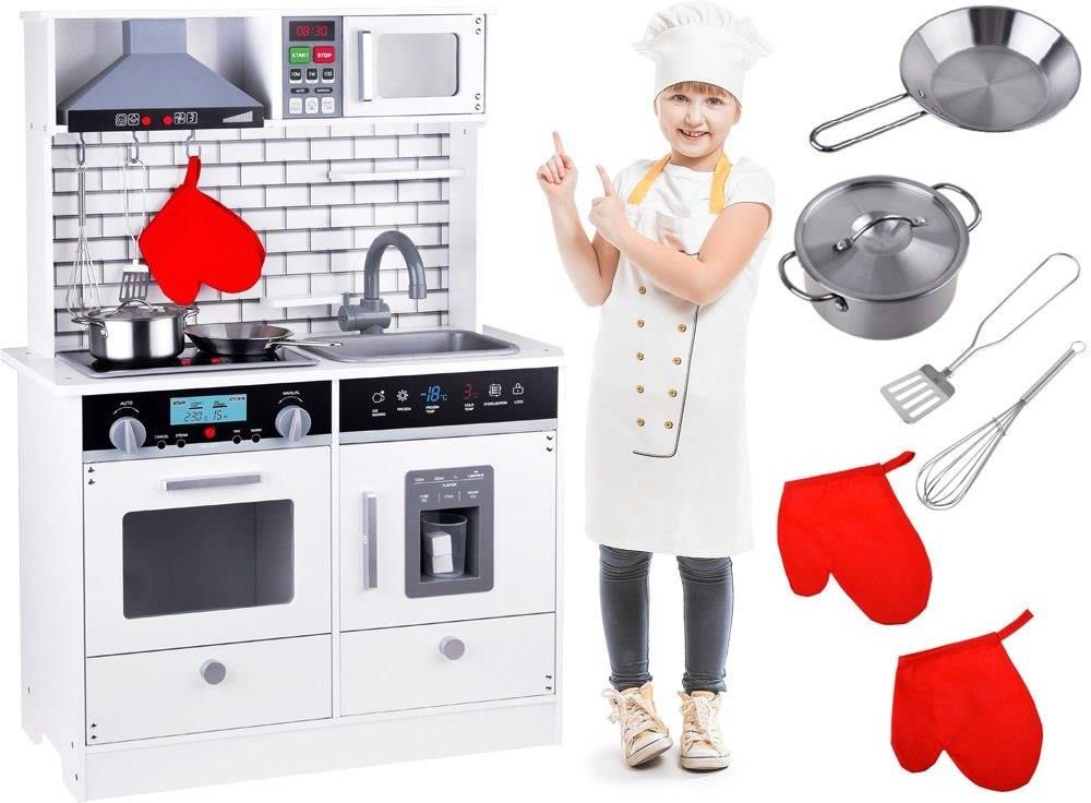 Drewniana, duża, kuchnia z oświetleniem, efektami dźwiękowymi i akcesoriami powoli każdemu małemu kucharzowi ugotować swoje przepyszne posiłki. Zestaw został bardzo efektownie wykonany, oraz zaopatrzony we wszystkie podstawowe sprzęty AGD. Meble zrobione z płyty MDF, pomalowane bezpieczną farbą w gustownym skandynawskim stylu. Kuchnia bogato wyposażona, w białym kolorze z modnymi cegiełkami będzie świetnie pasować do każdego pokoju dziecięcego, aneksu kuchennego. Kuchnia z efektami dźwiękowymi i świetlnymi pozwoli na jeszcze bardziej realistyczną zabawę w gotowanie. Efekty świetlne i dźwiękowe wymagają użycia 4 x baterii AAA, oraz 2 baterii AA 1,5 V (brak w zestawie). W skład zestawu wchodzi: - zlewozmywak z kranem - lodówka - kostkarka na lód - piekarnik - płyta indukcyjna - mikrofalówka - okap - haczyki Naczynia: - garnek z przykrywką - patelnia - łopatka - trzepaczka - 2 x rękawiczka - kubeczek na lód - kostki lodu Efekt podświetlania: - płyta indukcyjna - piekarnik - mikrofala Wymiary: - wysokość 92 cm - szerokość 65 cm - głębokość 30 cm - wysokość do blatu 50 cm Materiał: - płyta MDF, tworzywo sztuczne Dzieci uwielbiają naśladować dorosłych, podglądać jak rodzice funkcjonują w życiu codziennym, podczas gotowania posiłków dla rodziny. Dlatego taka kuchnia będzie idealnym prezentem dla małego członka rodziny. Samodzielnie przygotowane posiłki dla lal i misiów na pewno będą najpyszniejsze na świecie, a i za pewne babcia i dziadek też będą przeszczęśliwi jak skosztują obiadku przyrządzonego przez wnusie lub wnuka. Czasami z zabawy potrafi narodzić się pasja, a z pasji wymarzony zawód szefa kuchni, restauracji. Na początek wystarczy tylko zakup kuchni w stylu skandynawskim. Kuchnia do samodzielnego złożenia. Sklep Jokomisiada oferuje szeroki wybór sprzętów AGD, meble, garnki, urządzenia itp.