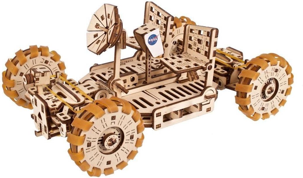 PO CO ŁAZIK NA KSIĘŻYCU? O ludziach można powiedzieć tak: kochamy odkrywać i kochamy samochody! Po tym, jak Neil Armstrong po raz pierwszy postawił stopę na Księżycu (Apollo 11, 21 lipca 1969 r.), minęły zaledwie dwa lata, zanim NASA wysłała samochód z astronautami Davidem Scottem i Jamesem Irwinem (Apollo 15, 31 lipca 1971 r.), aby mogli jeździć, a nie tylko chodzić, po powierzchni Księżyca. Najbardziej interesujące z naukowego punktu widzenia skały księżycowe nie zostałyby zebrane bez większego zasięgu eksploracji, na jaki pozwalał pojazd LRV (Lunar Roving Vehicle). LRV był imponującym dziełem inżynierii, które musiało wytrzymać dwukrotność swojej 209-kilogramowej masy, wytrzymać mikrometeoroidy poruszające się szybciej niż pociski i niezawodnie działać w temperaturach wahających się o 500 F. Podczas misji Apollo 17 łazik przejechał 22,3 mili w 4 godziny i 26 minut jazdy, choć najdłuższy dystans od modułu księżycowego wynosił tylko 4,7 mili, ponieważ astronauci musieli być w stanie wrócić pieszo do lądownika w przypadku awarii. Do dziś trzy pojazdy LRV pozostają na długoterminowym parkingu na powierzchni Księżyca. UGEARS ZDOBYWA KSIĘŻYC SWOIM ŁAZIKIEM. Łazik Księżycowy to efekt romansu z samochodami i eksploracją kosmosu, który w swojej konstrukcji bardzo przypomina prawdziwy LRV. Ten napędzany sprężyną drewniany model w skali 1:15 ma obracające się i wychylane koła, antenę, zamontowaną z przodu kamerę i wyrafinowany mechanizm składania do bardziej kompaktowej formy dla transportu na statku rakietowym. Dokładnie jak oryginał.. Gdy rozłożysz sekcje kół tego dynamicznego transformera, będziesz zaskoczony, gdy osie szybko zatrzasną się na miejscu, a koła z gumowymi bieżnikami automatycznie wskoczą na swoje miejsce! Ukryty klucz umieszczony pod podwoziem służy do nakręcania mechanizmu zapadkowego, a przełącznik Start/Stop pozwala nakręcić i zwolnić Rovera na odległość do 3 m. EAN: 4820184122031