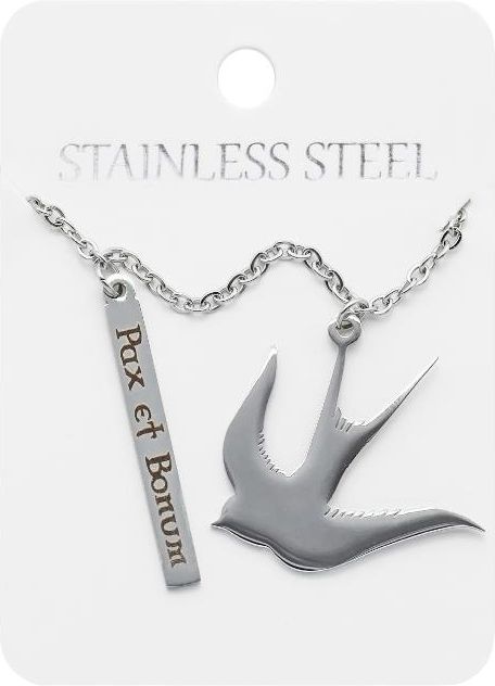 Naszyjnik z jaskółką i zawieszką Pax et Bonum wykonany ze stali nierdzewnej. Regulowana długość. Materiał: Stal nierdzewna Rozmiar: 30 mm (zawieszka)