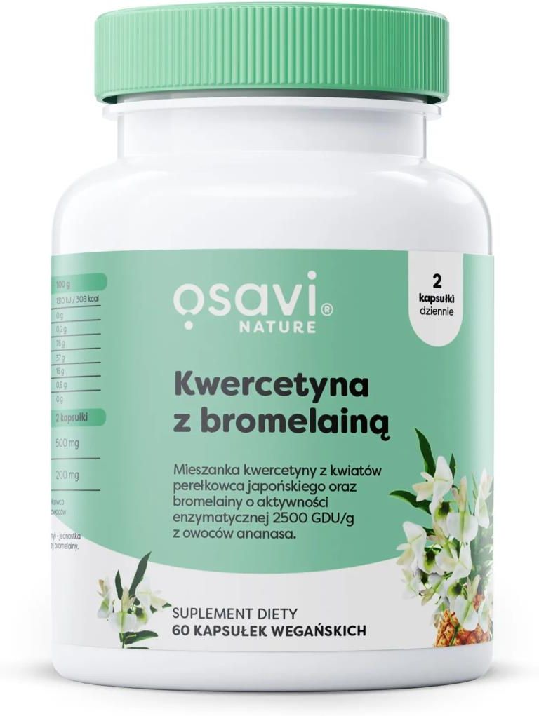 OSAVI Kwercetyna z bromelainą 60 kaps. Nowoczesna formuła łącząca kwercetyna z bromelainą Odpowiednia dla wegetarian i wegan Skład bez zbędnych dodatków OSAVI Kwercetyna z bromelainą to starannie opracowany suplement diety, który łączy w sobie wysokiej jakości kwercetynę FlaviPure® oraz naturalną bromelainę pozyskaną z owoców ananasa. Produkt jest dostępny w formie łatwych do stosowania kapsułek i zawiera standaryzowane dawki aktywnych składników. Wysokiej jakości kwercetyna FlaviPure® z perełkowca japońskiego W każdej porcji (2 kapsułki) znajduje się 500 mg kwercetyny FlaviPure®, pozyskiwanej z kwiatów perełkowca japońskiego (Sophora japonica) – rośliny cenionej w tradycji dalekowschodniej i współczesnej fitoterapii. Kwercetyna to naturalny flawonoid roślinny, który od lat cieszy się zainteresowaniem ze względu na swoje właściwości antyoksydacyjne i wspierające odporność. Naturalna bromelaina o wysokiej aktywności enzymatycznej Formuła została uzupełniona o 200 mg bromelainy standaryzowanej na 2500 GDU/g. Bromelaina to enzym proteolityczny pochodzący z ananasa, który wspiera trawienie białek i wykazuje aktywność biologiczną istotną z punktu widzenia regeneracji i równowagi organizmu. Dzięki standaryzacji na aktywność enzymatyczną produkt gwarantuje spójność i skuteczność działania. Naturalny skład i czysta formuła Produkt nie zawiera zbędnych dodatków technologicznych ani konserwantów. OSAVI Kwercetyna z bromelainą to czysty i przejrzysty skład, zamknięty w wygodnych kapsułkach roślinnych – odpowiednich także dla osób na diecie wegetariańskiej. Każda partia suplementu jest wysyłana do niezależnego laboratorium w celu szczegółowych analiz jakościowych, co potwierdza bezpieczeństwo i zgodność z deklarowanym składem. Dodatkowo, marka OSAVI dba również o środowisko – opakowanie produktu wykonane jest z tworzywa PET, które w 30% pochodzi z trzciny cukrowej i nadaje się w pełni do recyklingu. OSAVI Kwercetyna z bromelainą to produkt, który łączy siłę natury z nowoczesną technologią ekstrakcji. Dzięki synergicznemu działaniu bioflawonoidu i enzymu roślinnego, suplement ten może być cennym uzupełnieniem codziennej rutyny. To proste, skuteczne i wygodne rozwiązanie dla osób dbających o odporność, równowagę i świadomą suplementację każdego dnia. Zalecane spożycie: Informacje dodatkowe: Nie należy przekraczać zalecanej dziennej porcji. Suplement diety nie może być stosowany jako substytut (zamiennik) zróżnicowanej diety. Zrównoważony sposób żywienia i prawidłowy tryb życia jest ważny dla funkcjonowania organizmu człowieka. Przechowywanie: Przechowywać w szczelnie zamkniętym opakowaniu, w temperaturze pokojowej 15‑25°C, w suchym miejscu, w sposób niedostępny dla małych dzieci. Chronić od wilgoci i światła. Środki ostrożności: Nie stosować w przypadku nadwrażliwości na którykolwiek ze składników. W przypadku występowania chorób lub stosowania produktów leczniczych skonsultować przyjmowanie suplementu diety z lekarzem. Nie stosować u dzieci, kobiet w ciąży i w trakcie laktacji. Producent:Olivit Sp. z o.o.ul. Blacharska 1161-006 Poznań Sprzedawca:MZ-Store S.A.ul. Cypriana Kamila Norwida 4784-240 RedaPolska